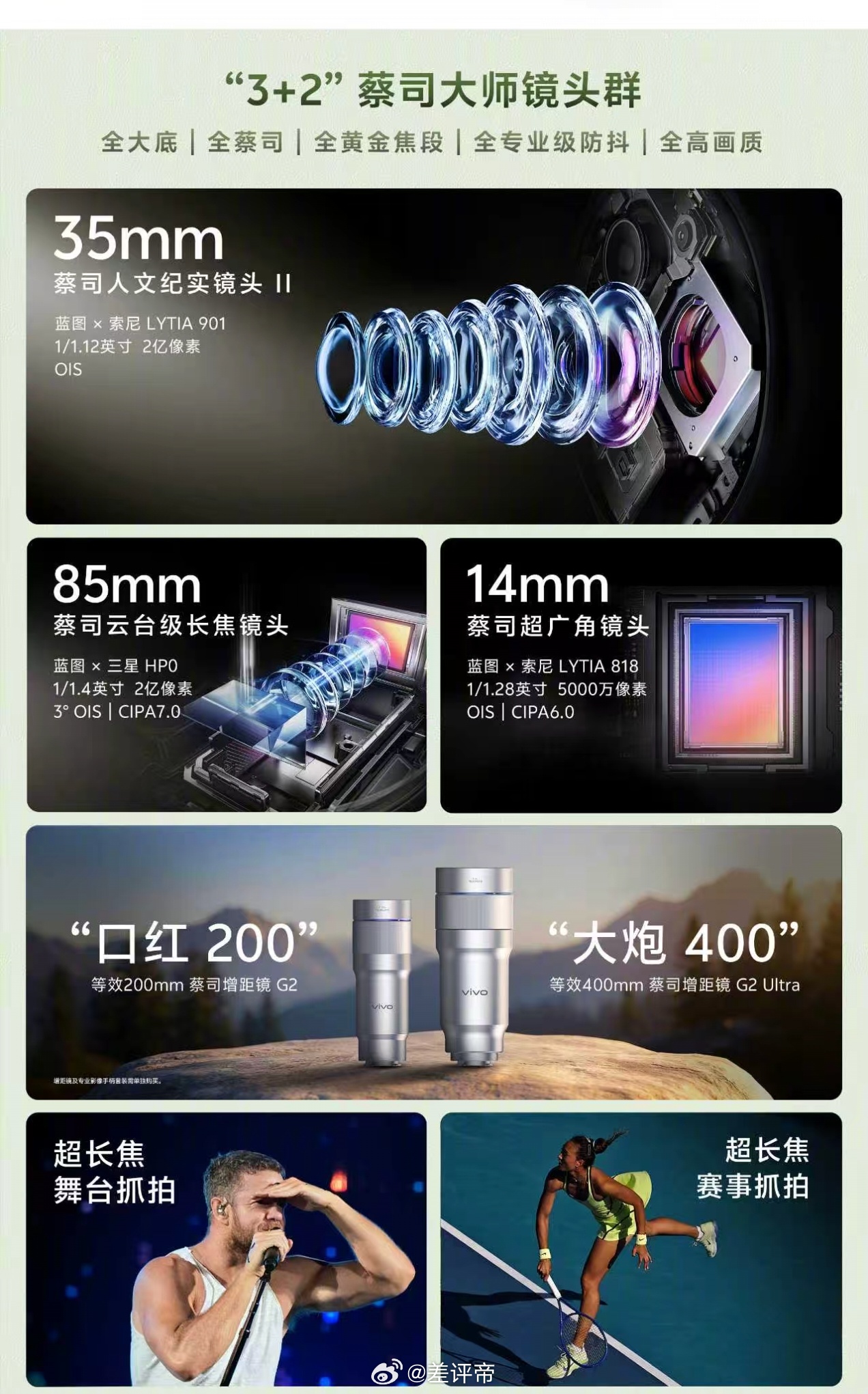 核心亮点1. 配备「3+2」蔡司大师镜头群,全焦段大底、全蔡司认证、全焦段专业防抖:35mm蔡司人文纪实镜头II:蓝图联合索尼定制LYTIA 901传感器,1/1.12英寸大底,2亿像素,支持OIS光学防抖85mm蔡司云台级长焦镜头:蓝图联合三星定制HP0传感器,1/1.4英寸大底,2亿像素,3° OIS,防抖规格达CIPA 7.014mm蔡司超广角镜头:蓝图联合索尼定制LYTIA 818传感器,1/1.28英寸大底,5000万像素,OIS光学防抖,防抖规格达CIPA 6.0额外搭配12光谱通道500万像素蓝图原色摄像头,精准还原真实色彩2. 支持外接专业增距镜:可选等效200mm蔡司增距镜G2(“口红200”)、等效400mm蔡司增距镜G2 Ultra(“大炮400”),适配舞台、赛事等远摄抓拍场景