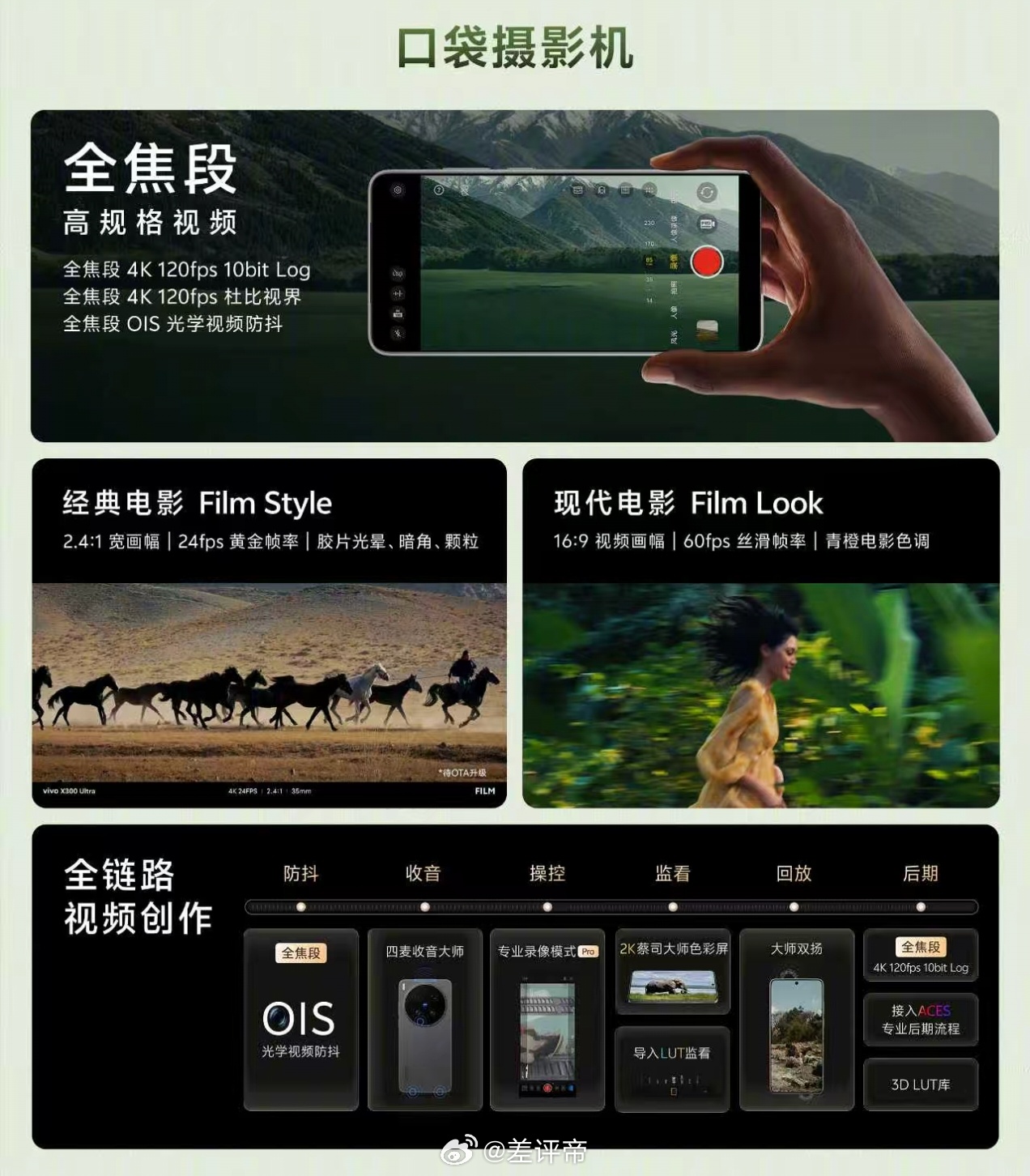 3. 全场景人像与自定义色彩:搭载蓝图原生色彩系统,覆盖蓝图原生人像、全焦段追光人像、闪光人像2.0,逆光、暗光环境都能稳定出片;提供蓝图调色盘,支持自定义色彩配方与配方分享,满足个性化创作需求二、全链路专业视频创作能力全焦段高规格视频拍摄:支持全焦段4K 120fps 10bit Log、全焦段4K 120fps杜比视界拍摄,同时支持全焦段OIS光学视频防抖专业电影模式:内置经典电影、现代电影两种风格,分别对应2.4:1宽画幅24fps黄金帧率、16:9画幅60fps帧率,自带专业影调全流程创作支持:覆盖防抖、收音、操控、监看、回放、后期全链路,配备四麦收音大师、专业录像模式、2K大师色屏监看、专业后期流程适配等三、旗舰级硬件配置搭载第五代骁龙8至尊版处理器2K蔡司大师色彩屏,支持1-144Hz动态刷新率、Ultra XDR显示、超高亮度配备6600mAh+100W超快闪充、40W无线闪充超声波3D指纹、定制超感振动马达、IP68+IP69级防尘防水、寰宇信号放大系统3.0支持卫星通信,有专属卫星通信版本vivo X300 Ultra专业V单vivo X300s超能小V单