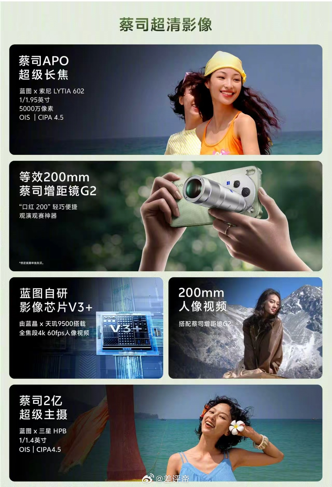 亮点:核心优势主摄为2亿像素三星HPB传感器(1/1.4英寸,支持OIS光学防抖)长焦为5000万像素索尼LYTIA 602传感器(蔡司APO认证,支持OIS光学防抖),可外接200mm增距镜支持全焦段4K 60fps人像视频,配备旗舰同款人像算法、胶片色彩与AI拍摄功能