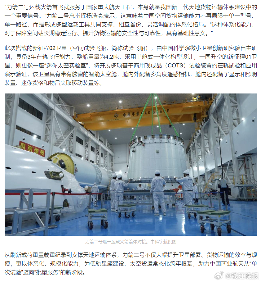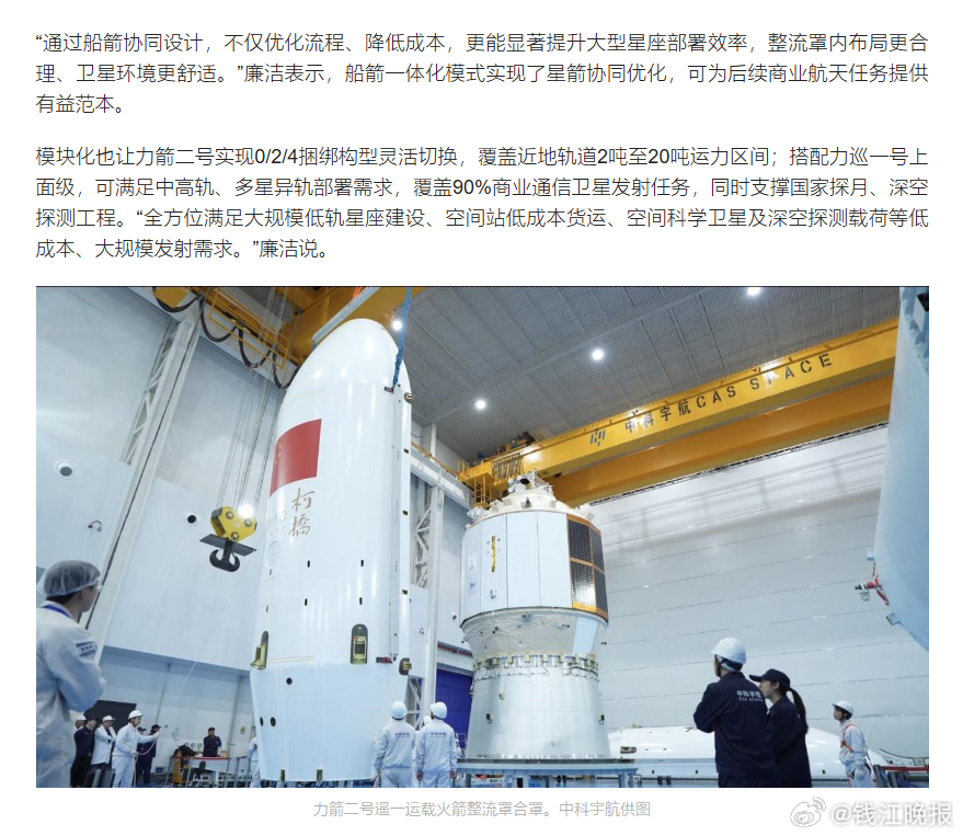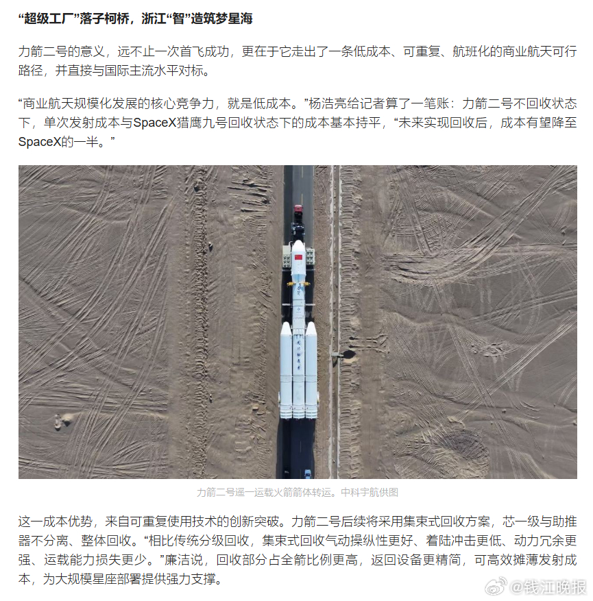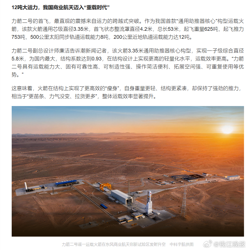 当大漠戈壁的尾焰渐渐消散,人们会发现,这枚火箭的未来,其实早已落子浙江绍兴柯桥。力箭二号“国际纺都号”的一飞冲天,更像是一份清晰的产业宣言——一套全新的火箭研发制造体系、一条可行的低成本天地货运通道、一座即将成型的商业航天产业地标,正从柯桥的蓝图里,一步步变为现实。网页链接 (潮新闻 特派记者 王晶)