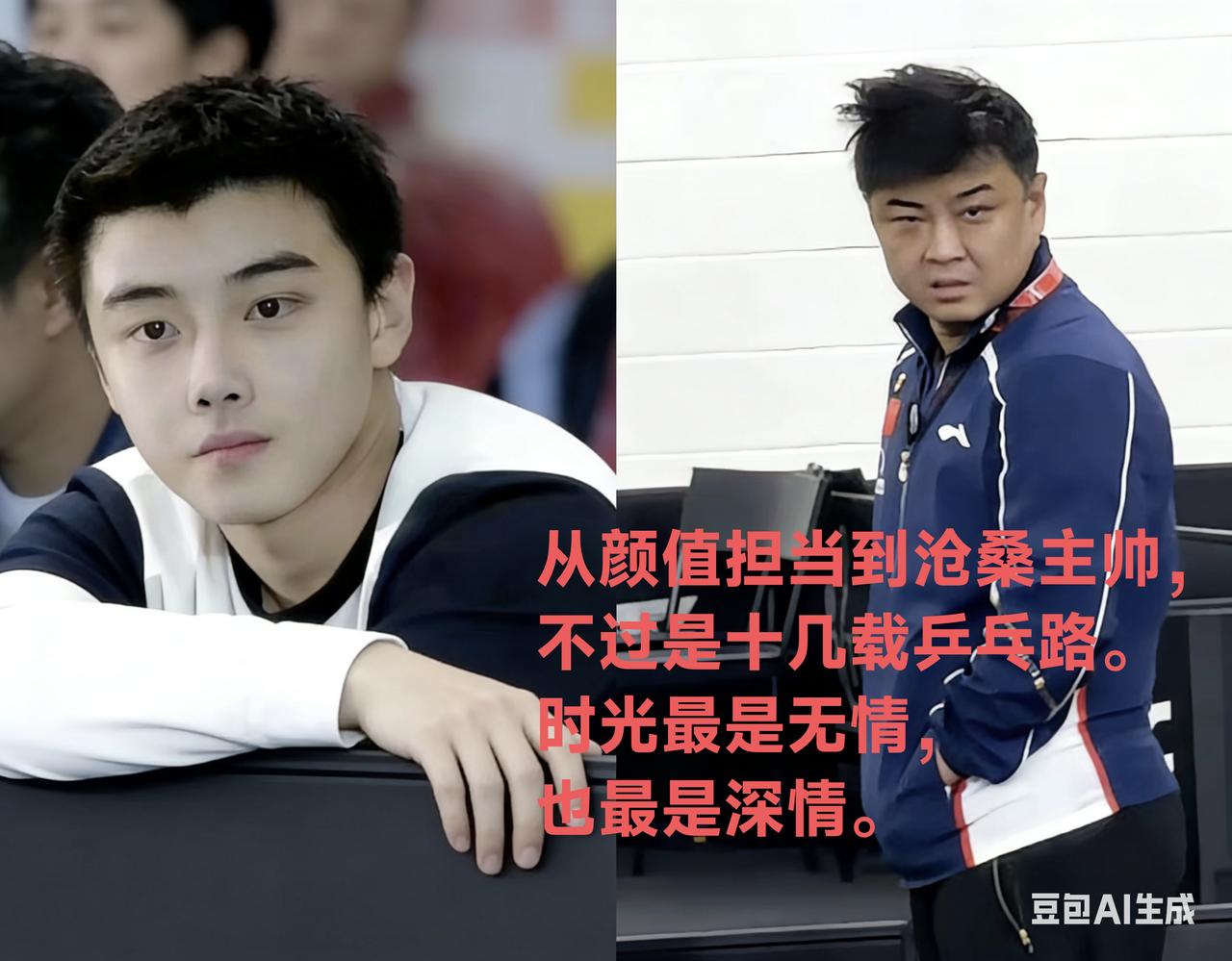 以前是球台上意气风发的清冷少年,眉眼如画,反手横打即是天下;现在是场边眉头紧锁的疲惫主帅,发福显老,满眼皆是化不开的愁绪。王皓