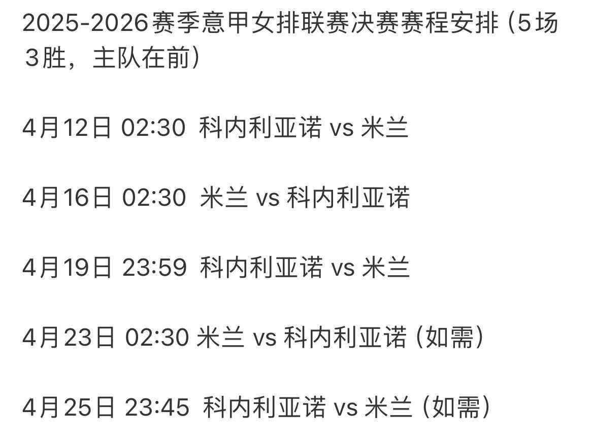 意甲女排决赛的海报中科内利亚诺队居然没有朱婷?!意甲女排官方公布2025-2026赛季联赛决赛的海报和赛程,比赛采用5场3胜,虽然海报中科内利亚诺女排没有朱婷,但是真到了比赛的关键时刻恐怕科内利亚诺就不能少了朱婷了!
