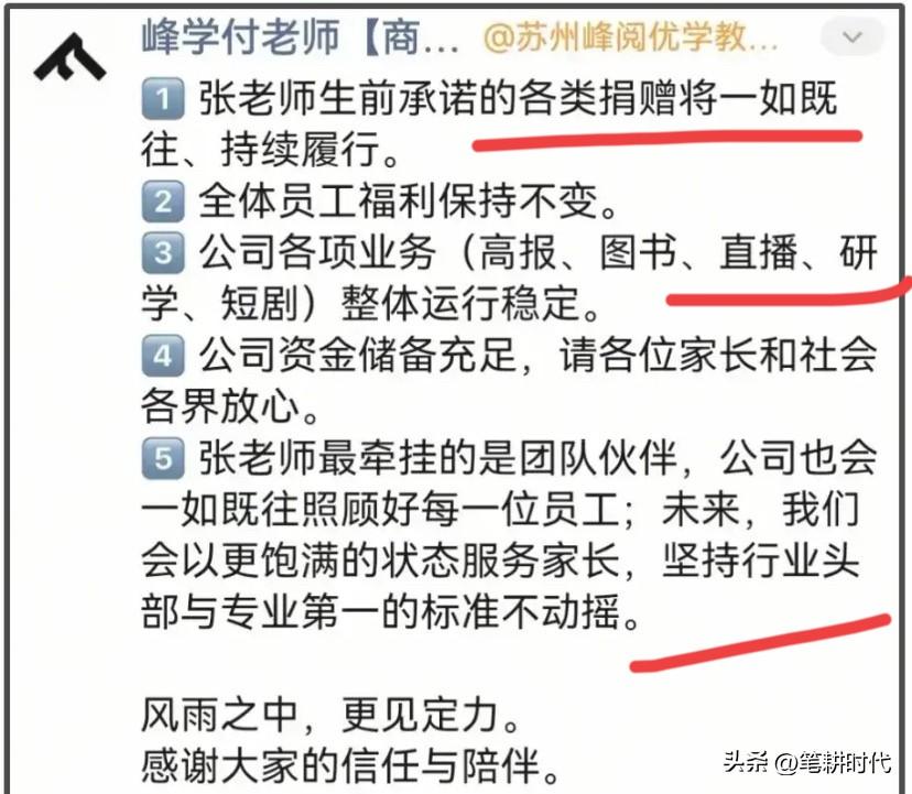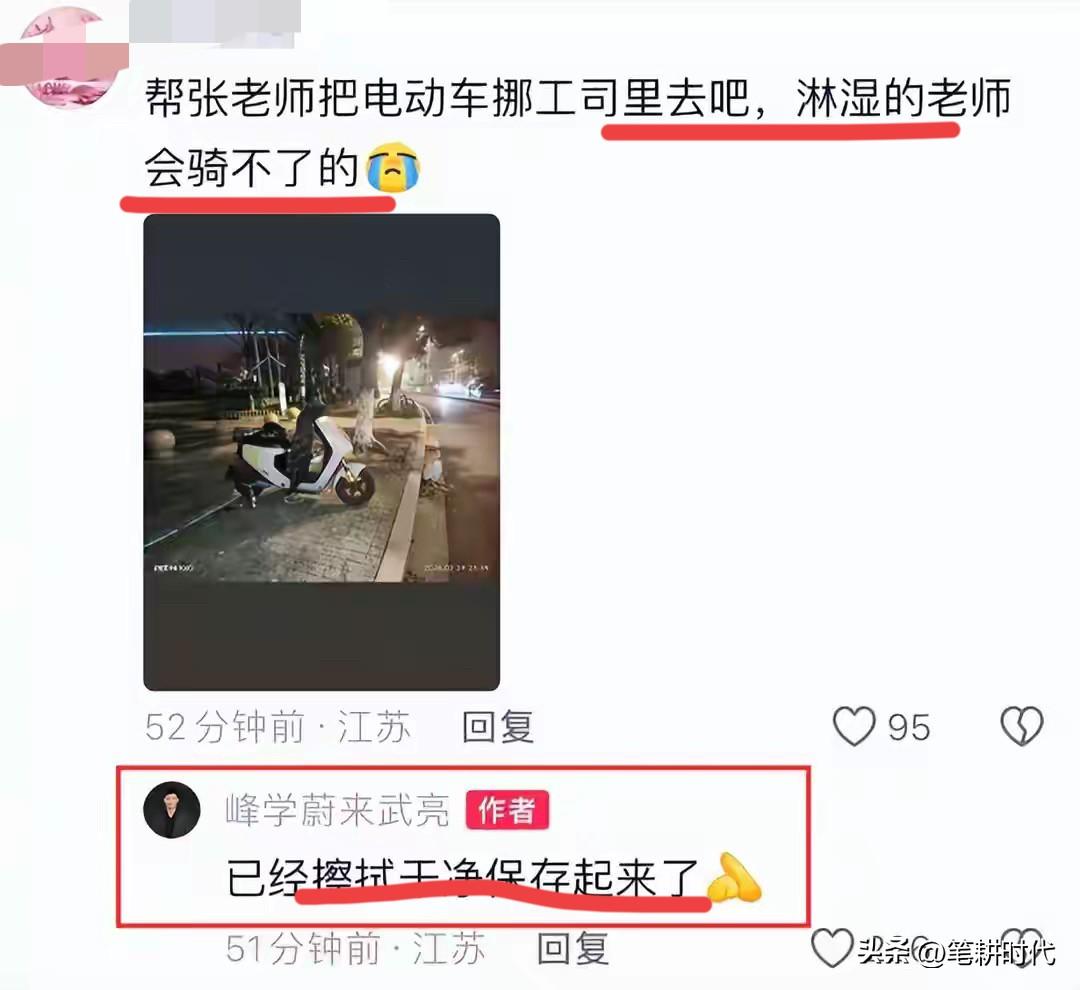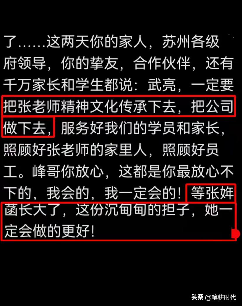 张雪峰去世头七 ,公司总经理发文承诺,亲口透露对张姩菡安排,更惹人泪目的是,武亮回复已经把电瓶车擦拭干净保存起来了。 张雪峰最放不下的就是公司和女儿,最大的牵挂就是11岁的女儿张姩菡,不知道有没立过遗嘱,她最终能分得父亲的多少财产也是最让人关注的。 武亮发千字文悼念,表示张老师的个人账号作品会一直保留,到张姩菡长大,交到她手里。还承诺张姩菡长大后接手公司。 3月29日深夜,有人发现张雪峰的电动车还停在路边,留言说淋湿了张老师会骑不了的。 武亮回复已经擦拭干净保存起来了,看到这句话,就想到张雪峰每天骑电瓶车去校门口接女儿的画面。 但是不少网友担心未来的公司,最怕负债还得倒贴。 认为最好的结果就是套现股份,不用接班了,到时候这一行就没有市场了。谁想经营谁买去股份,哪怕人不在了市值缩水只剩五分之一也卖,不然一两年后每年亏几千万,四百多员工最后一分没有。 他们之所以有这种担心,认为一个极度依赖创始人IP的公司,一旦创始人不在,这个公司很大概率也就结束了,大家信任的是张雪峰这个人,而不是他的公司。 时间是不等人的,别说十年后的事,就是一年后的事谁也不敢保证会发生什么。