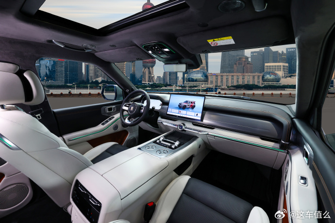 然后就是车内增加了全新的方形悬浮式中控屏,后排也增加了全新的翻折吸顶屏以及天窗、二排隐私帘等等。
