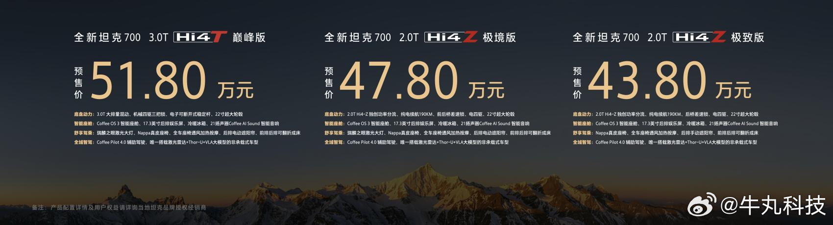 要说能代表中国越野的品牌,那必须是坦克!短短5年时间,坦克真的把越野玩出了新高度,从坦克300引爆全球方盒子热潮,到500开启豪华越野新时代,再到400解锁潮酷越野,彻底打破了大家对越野只有硬朗粗犷的刻板印象,让越野变成了普通人也能拥有的生活方式。这5年坦克全球销量快90万台,国内每卖出2辆越野车就有1辆是坦克,硬生生把越野从发烧友的小众圈层,变成了人人玩得起的日常,真正实现了越野平权。更牛的是坦克的全栈自研技术,自主研发的3.0T V6发动机直接打破外资在大排量动力的垄断,如今的Hi4-Z电混架构、Coffee Pilot 4.0智驾系统,更是让越野车的全场景体验直接升级。2025年坦克平均售价近30万,20万以上市占率稳在70%,凭硬实力拿下了越野市场的定价权和话语权。从国内一枝独秀到走向全球,坦克早已不是只做越野车的品牌,全新坦克700的到来,更是开创了全域豪华SUV新品类,让中国越野品牌在全球舞台上站稳了脚跟!现在全新坦克700正式开启预售,新车推出3.0T Hi4-T、2.0T Hi4-Z两大动力版本共3款车型,官方预售价43.80万-51.80万元。