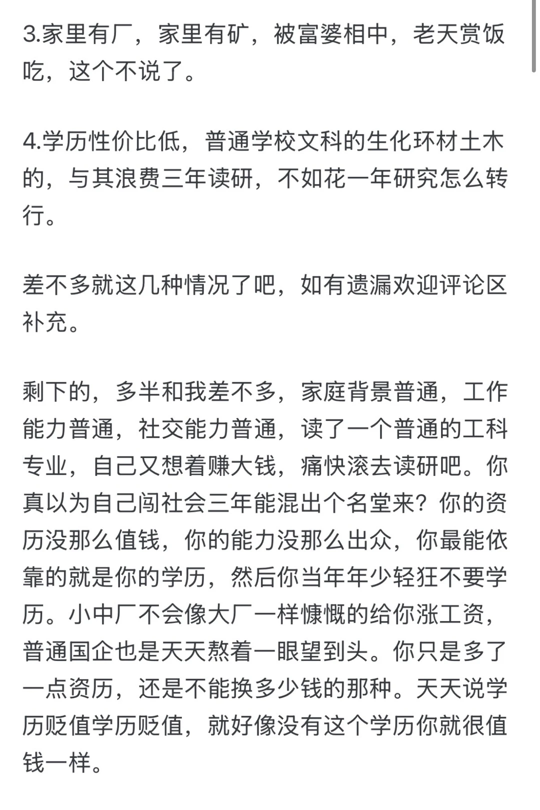 当年我也不信这个邪,没去读研,觉得自己早点出来工作三年未必不如读研那些人。现在看,对于我自己来说没有读研好像确实有亿点点亏。现在我觉得不太需要读研的只有几种情况: