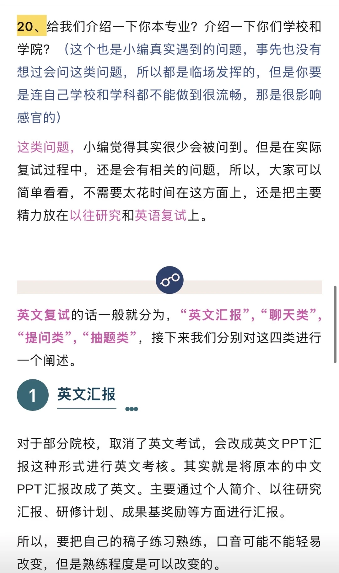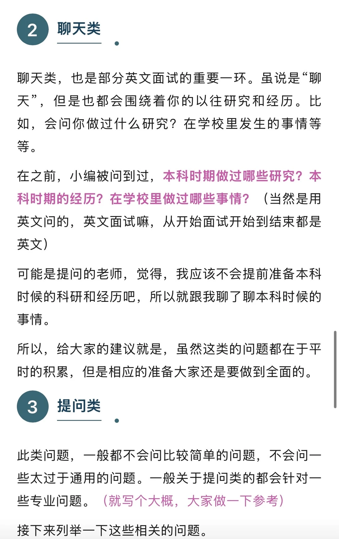 聊天类,也是部分英文面试的重要一环。虽说是“聊天”,但是也都会围绕着你的以往研究和经历。比如,会问你做过什么研究?在学校里发生的事情等等。
