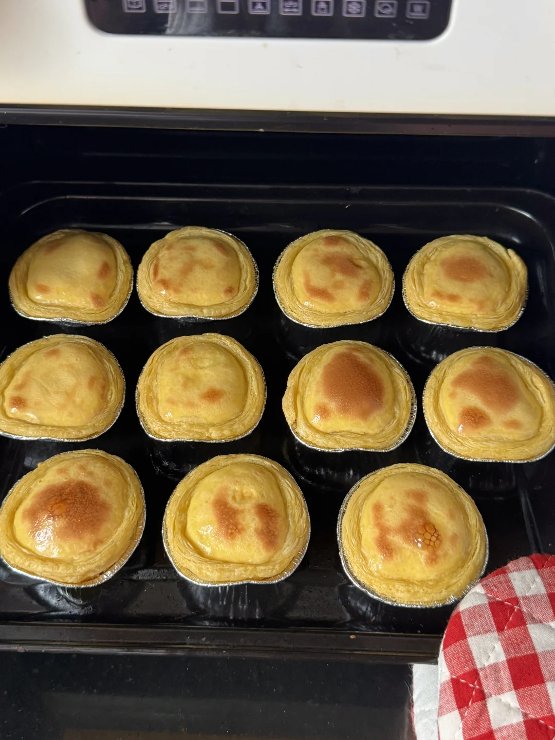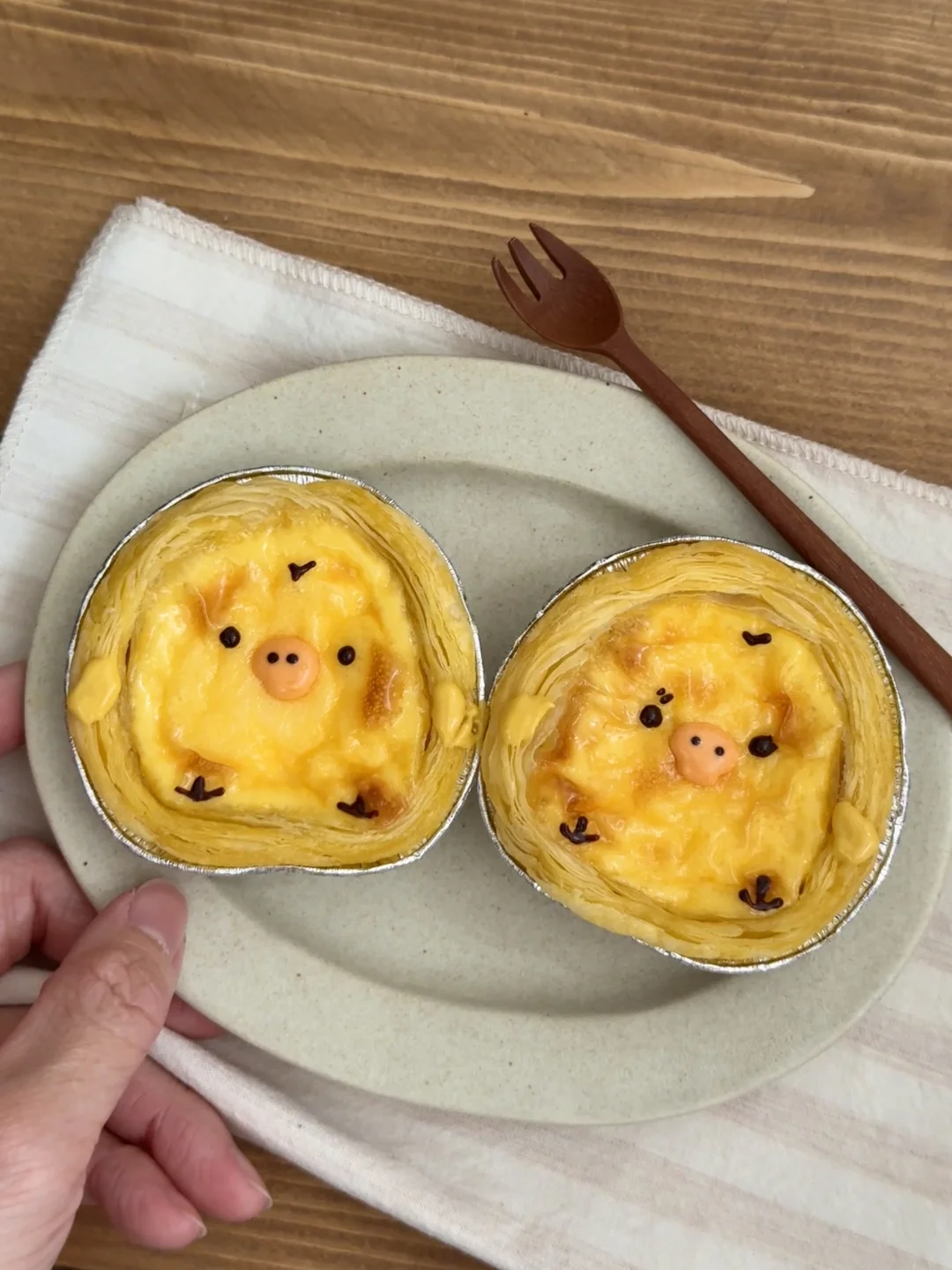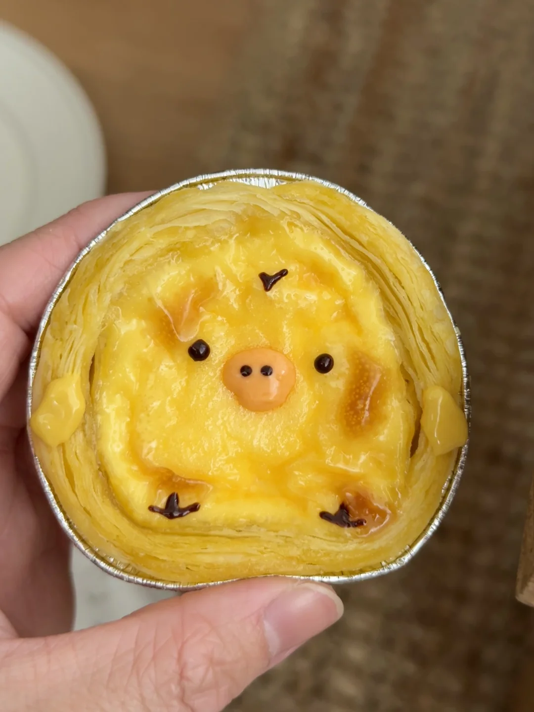 今天消耗一下冰箱里的淡奶油和蛋挞皮 做了可爱的鼻孔鸡蛋挞 - 材料:蛋挞皮10-12个、牛奶80g、淡奶油180g、炼奶70g、蛋黄2个、全蛋1个 步骤: 1️⃣制作蛋挞液前先把蛋挞皮拿出来解冻一下 2️⃣将蛋液、炼奶、牛奶、淡奶油全部混合搅拌均匀,过筛2遍,烤箱预热的期间让蛋挞液静置一会 3️⃣解冻好的蛋挞皮稍微捏成小鸡的形状,将蛋挞液倒入蛋挞皮里,送入烤箱210度烤25分钟,出炉后用巧克力酱画表情