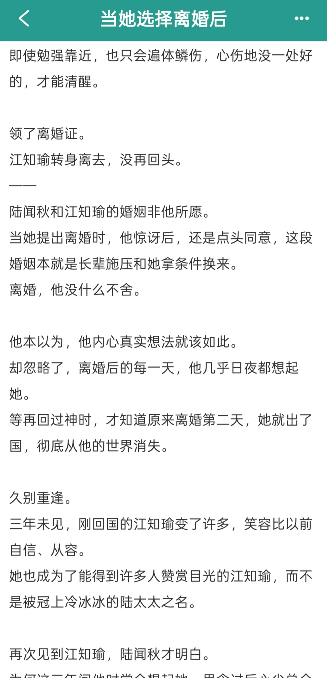 男女主是没有感情的婚姻,但男主不知道女主暗恋他多年,离婚后男主放不下女主,等女主回国后更加清楚对她的心意,无论女主怎么拒绝被虐到卑微了男主都不放弃!矜贵公子为爱低头!
