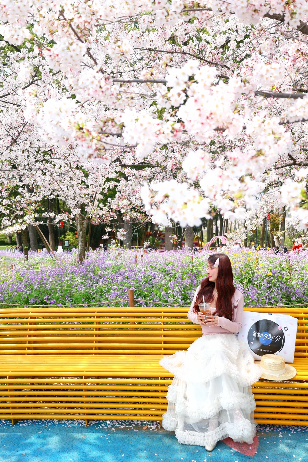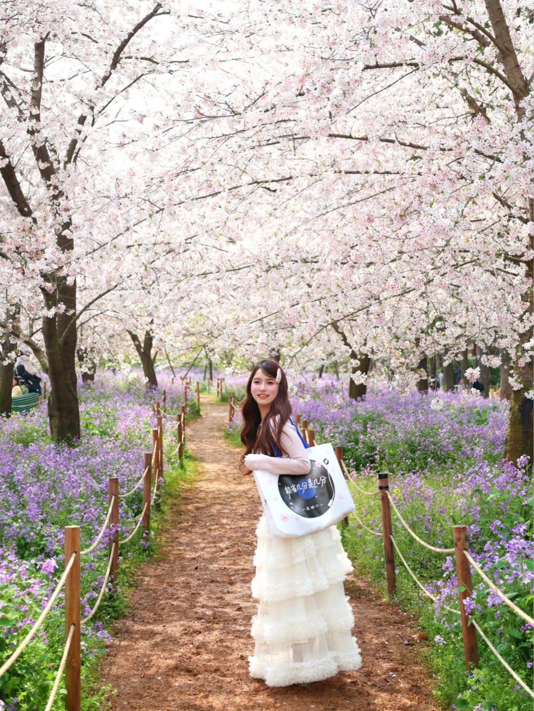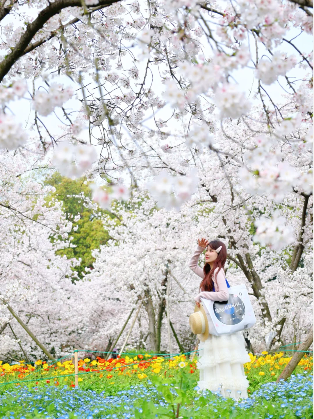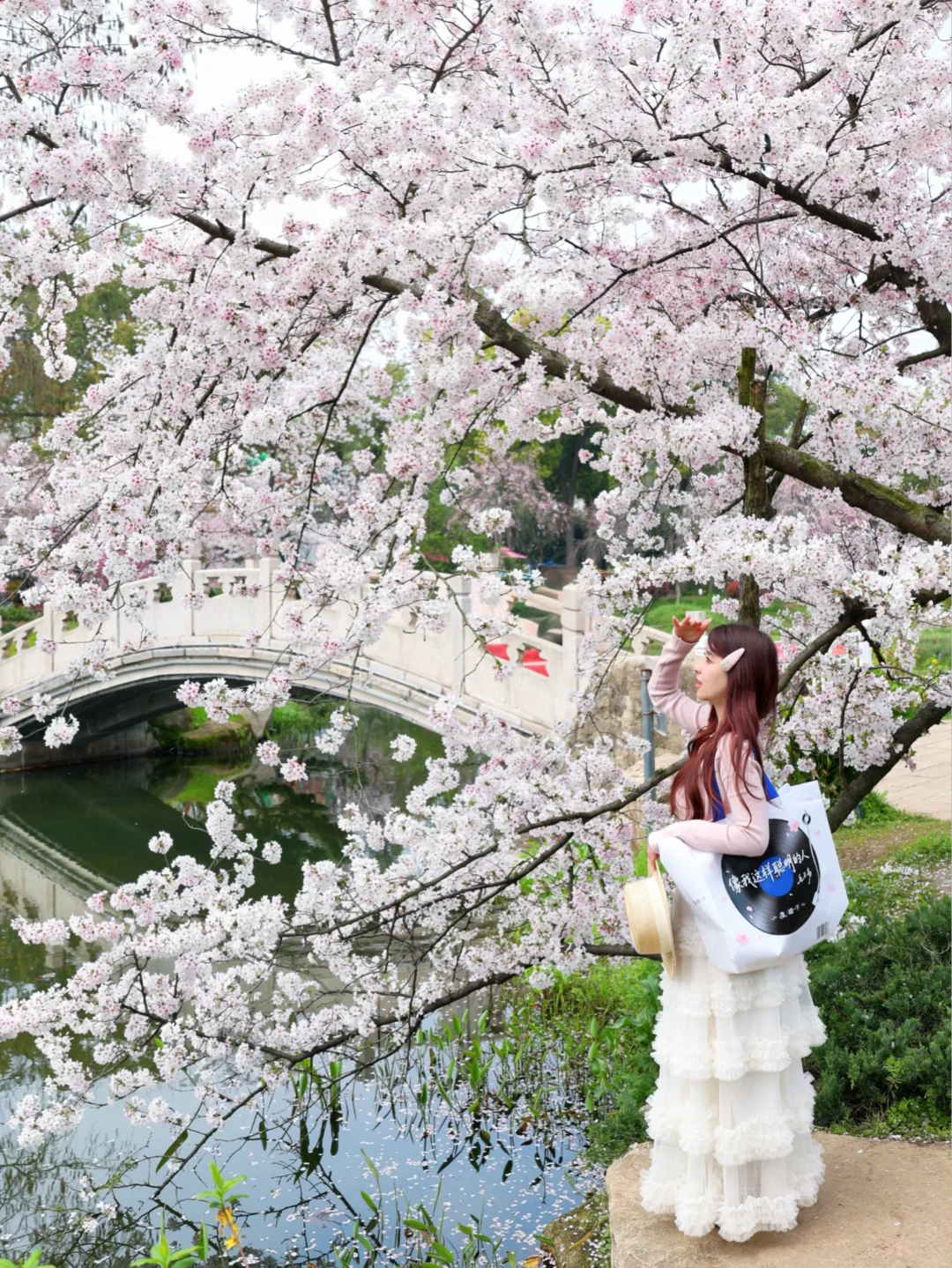 盼了一年!!武汉的樱花终于进入盛开期🌸 狂拍了180张照片 顺手便利店碰一下get了个出片包 白色的和今天的裙子也很搭 我果然无法抗拒被鲜花包围的武汉!!!! -