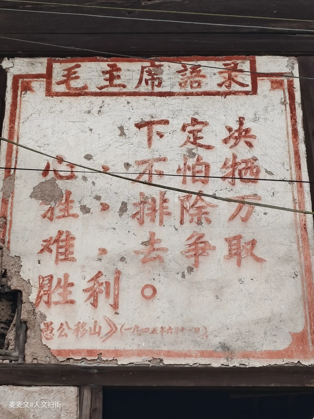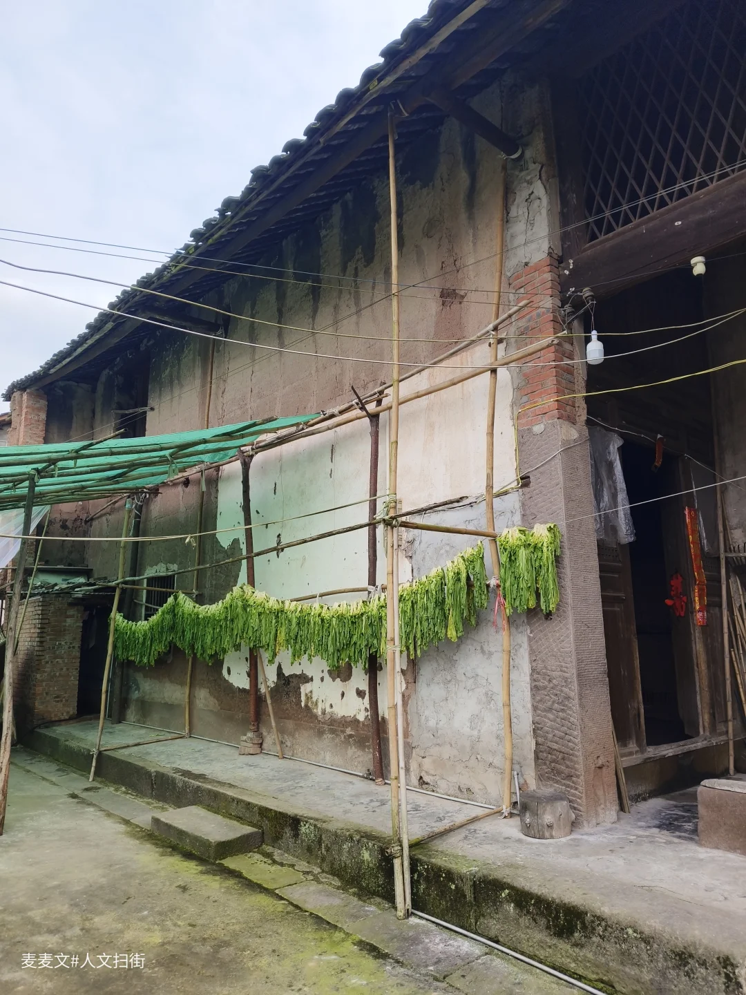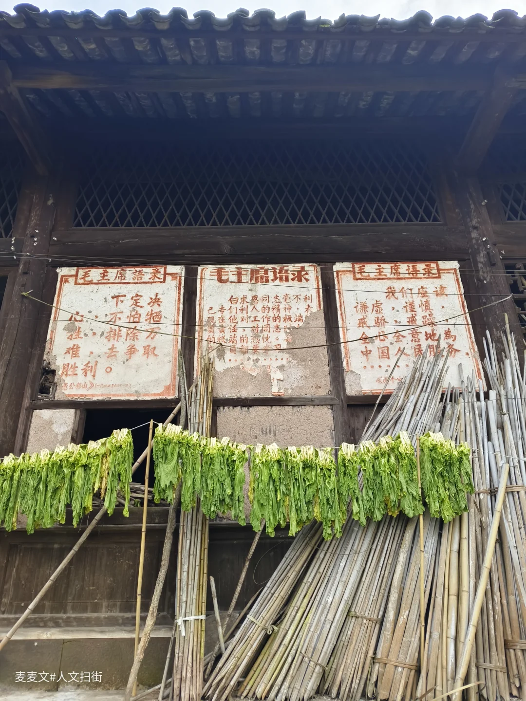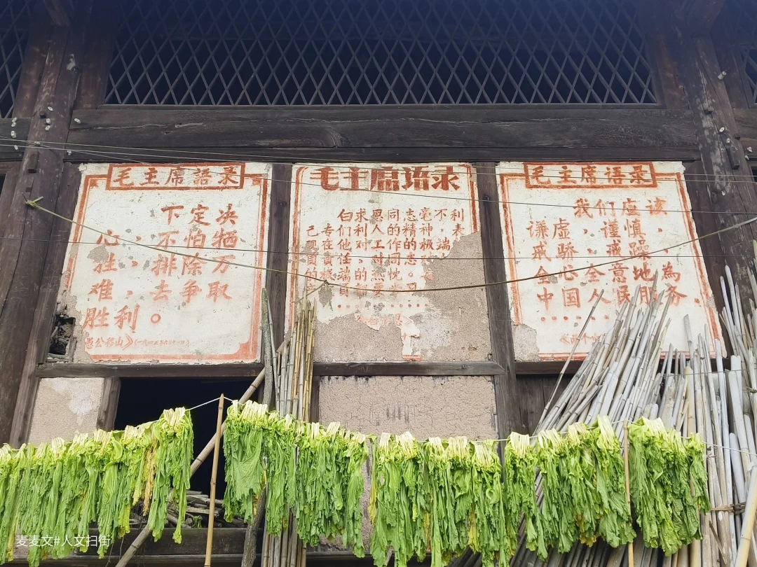 土夯墙斑驳,木梁架依旧挺立,屋檐下晾晒的青菜、门口的石缸,还在诉说着烟火日常。最动人的是墙上留存的旧时朱红标语,字迹虽有些模糊,却像时光邮戳,把不同年代的故事钉在了一起。