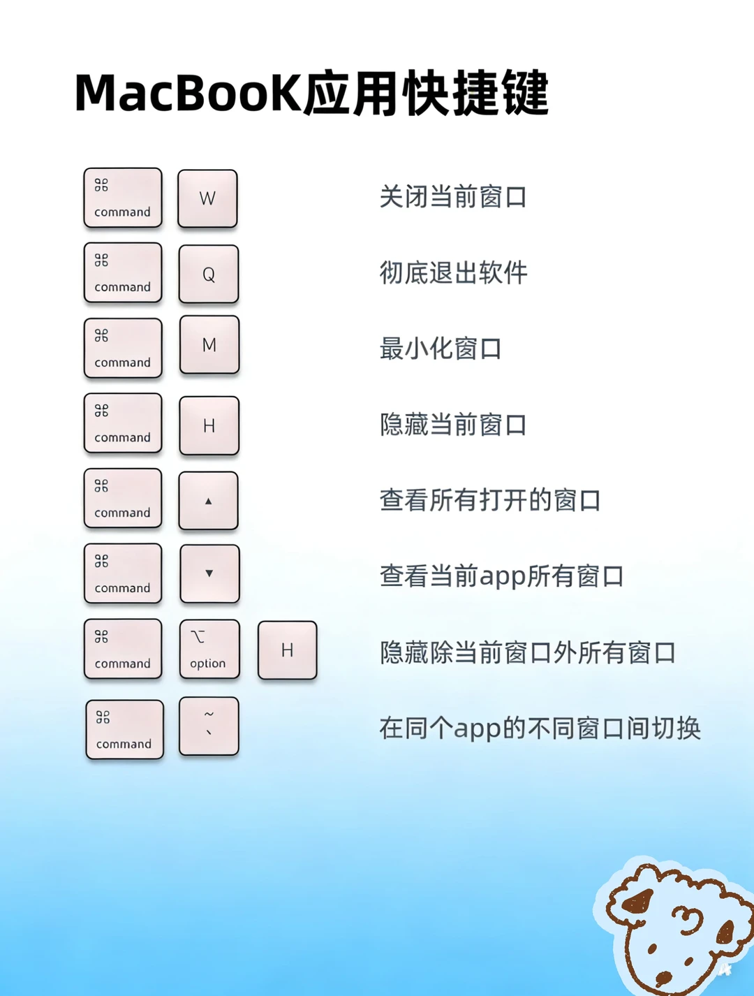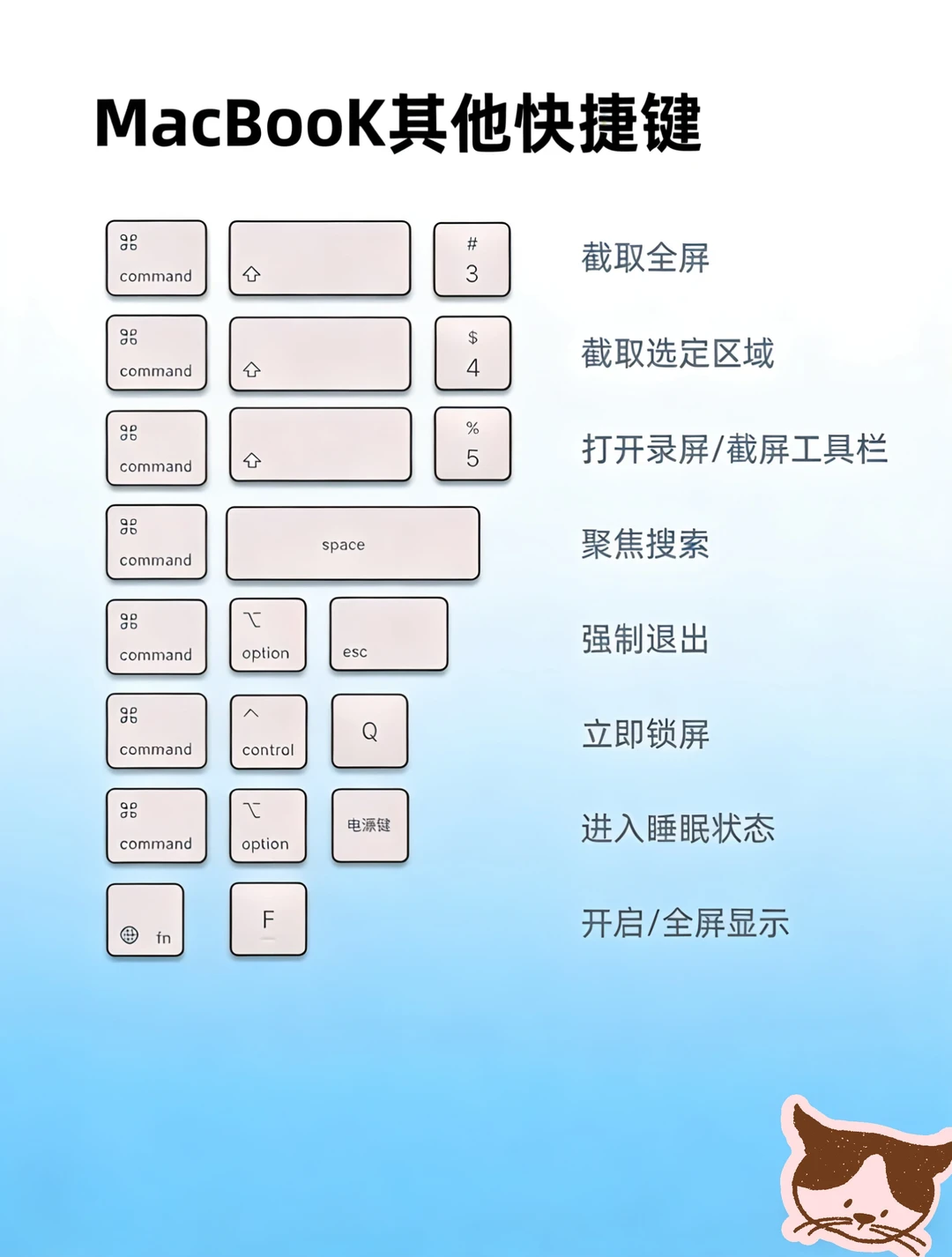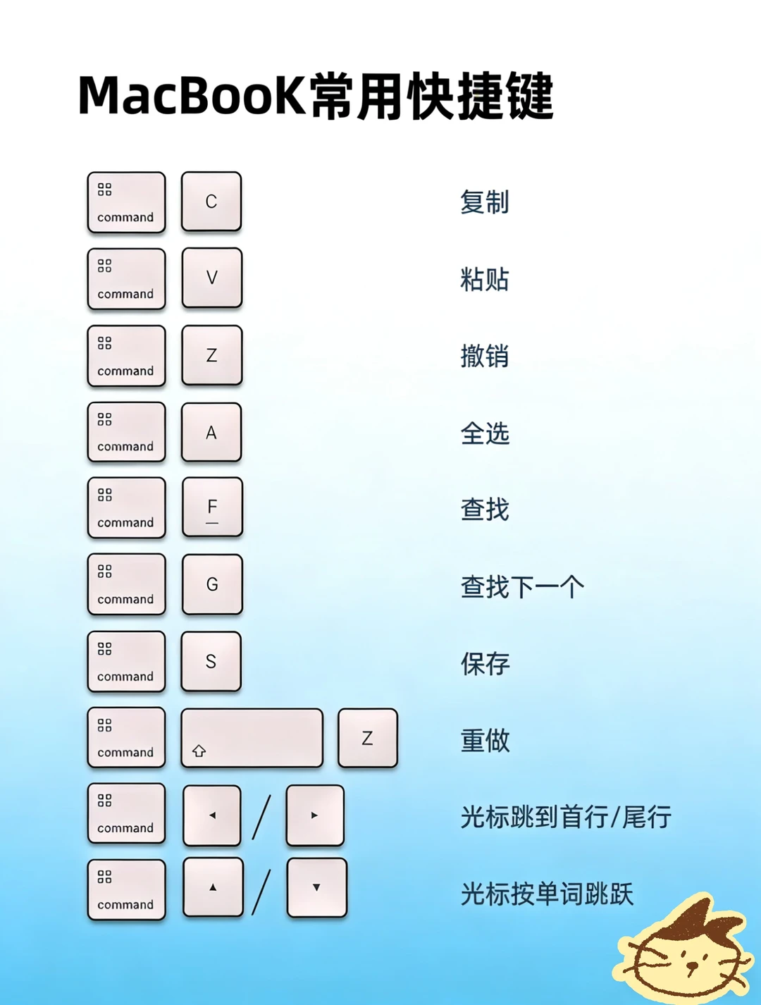 告别低效!MacBook最全快捷键速查表整理好了📚 3张图覆盖常用编辑、应用操作、系统功能,从基础到进阶都有 📌 基础操作:Command+C/V/Z/A/S 高频必备 📌 应用管理:窗口切换/隐藏/强制退出 流畅办公 📌 系统工具:截图录屏/聚焦搜索/锁屏 一键直达 适合Mac新手、打工人、学生党,提升效率的同时还能装杯🤌