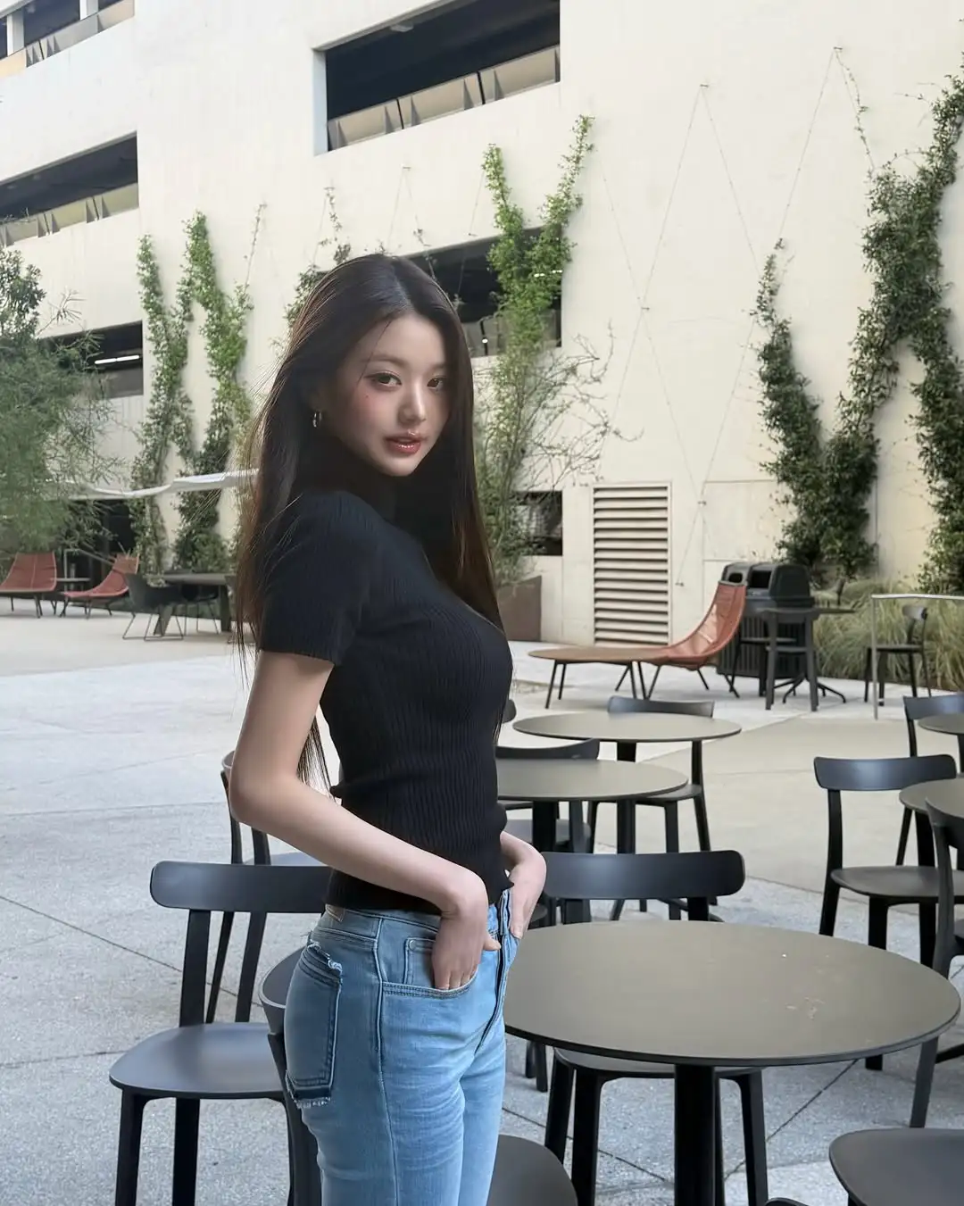 张元英今日更新ins,简单的黑色针织短袖配紧身牛仔裤,更显好身材! 图片来源张元英