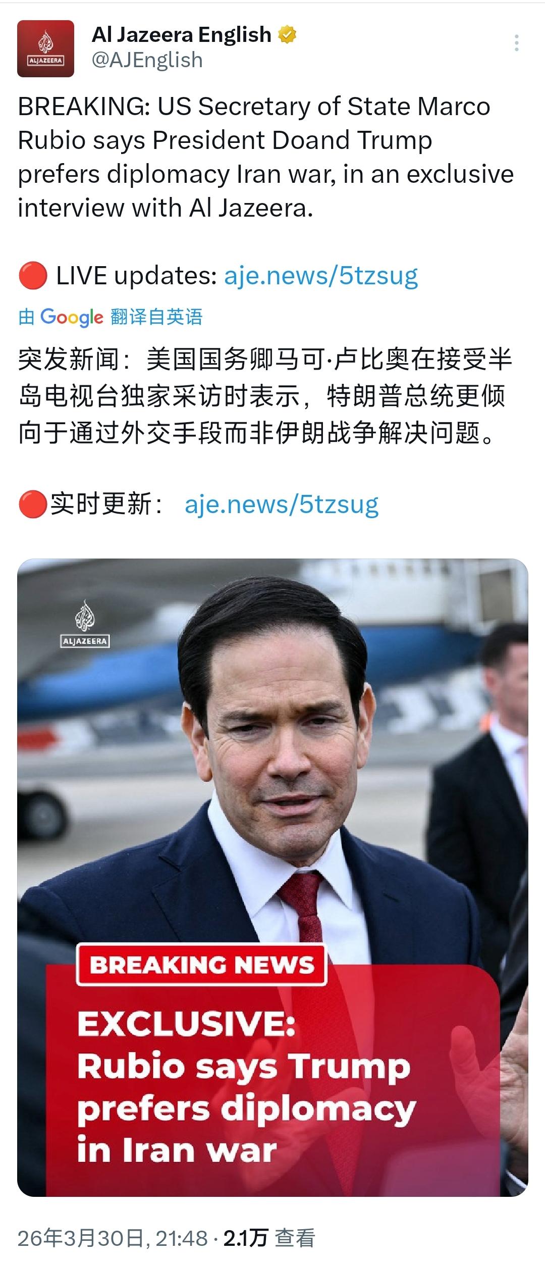 半岛电视台今晚(3月30日晚)报道:“突发新闻:美国国务卿马可·鲁比奥在接受半岛电视台独家采访时表示,特朗普总统更倾向于通过外交手段而非伊朗战争解决问题。” [机智]评几句:谈判过程中,突然发起军事行动的是美国。现在不断集结军力,叫嚣倾向于外交手段的又是美国。这样的美国,伊朗人还会相信吗?美方一边让鲁比奥放话偏爱外交,一边向中东增派特种部队、谋划对伊“致命一击”。嘴上谈和平,手上挥屠刀,这套“边打边谈”的戏码不过是极限施压的老套路。此前美伊谈判刚有进展,美国便伙同以色列突袭伊朗,炸古迹、伤平民、毁科研设施,如今又抛出不合理停火计划,妄图以武力逼伊朗让步。特朗普一边喊着谈判顺利,一边扬言夺取伊朗石油、占领哈尔克岛,美方的所谓外交,从来都是军事威慑的遮羞布。这样毫无诚意的表演,只会让伊朗更加坚定以强硬反制霸权的决心。