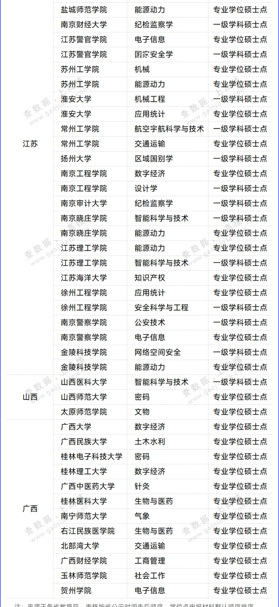 据高绩整理统计,截至发文,共有52所高校通过省级统筹拟增设74个学位点,包括25个一级学科硕士点和49个专业学位硕士点。