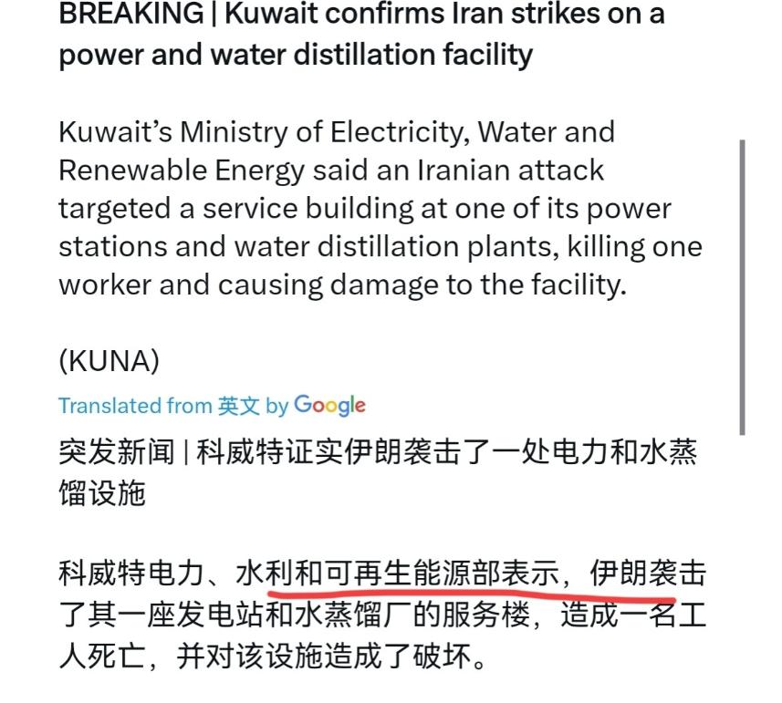 科威特麻烦大了!伊朗说到做到,伊朗真打海水淡化设施了!3 月 30 日,根据科威特通讯社报道,科威特证实伊朗袭击了一处电力和海水淡化设施,袭击造成一名工人死亡,设施受损。 很显然,美国和以色列刚动手炸伊朗本土电力、能源及海水淡化厂,没想到伊朗的反击来的这么快。 伊朗的出手打击,这当然是告诉美国及盟友,伊朗严格兑现 “对等反制”,绝无虚言。 这次袭击瞄准的不是军营、不是港口、不是导弹基地,而是科威特家家户户都离不开的淡水与电力生命线,中东这场博弈已经从常规军事对抗,直接戳到了海湾国家最脆弱的生存软肋,科威特这一次是真的被架在了火上烤,往后的日子只会越来越难。 大家都清楚,中东是全球最缺水的地区之一,沙漠广布、降水稀少,地表几乎没有能支撑大规模人口使用的河流与湖泊,石油遍地都是,可一滴能直接喝的淡水都找不到,对科威特、卡塔尔、沙特、阿联酋这些海湾国家来说,海水淡化厂就是国家的命根子,数据显示科威特国内超过九成的饮用水都来自海水淡化,电力供应也高度依赖与水厂配套的能源设施,一旦海水淡化厂停摆,不用等导弹炸,断水断电几天,整个社会运转就会直接瘫痪,民众生活、工业生产、商业活动全都会陷入停摆,这比打击军事基地的杀伤力还要直接、还要致命。 美国和以色列显然早就盯上了这一点,从 2 月底开始,两国联手不断升级对伊朗的打击范围,不再局限于军事目标,而是把伊朗的电力设施、能源枢纽、海水淡化厂都纳入打击清单,就在这次科威特设施遇袭前一天,伊朗首都德黑兰还遭到大规模空袭,多处电力设施受损,部分区域一度停电,民用基础设施接连被炸,伊朗的忍耐早就到了极限,之前伊朗就多次公开警告,只要美以敢攻击伊朗的民生与能源设施,伊朗就会用一模一样的方式反击,绝不手软,很多人还觉得这只是口头威胁,觉得伊朗不敢轻易动海湾国家的核心设施,可现在事实摆在眼前,伊朗不仅敢,而且出手极快、目标极准,完全不拖泥带水。 这一轮对抗最狠的地方,就是双方都打破了过去战争中尽量不攻击民用关键设施的默契,美国以为靠着优势军力,炸掉伊朗的水电设施,就能逼伊朗妥协投降,就能把伊朗的经济与社会拖垮,可他们忘了,伊朗在中东经营多年,手里握着大量精准打击武器,导弹和无人机的射程完全覆盖整个波斯湾,美国能打伊朗的民生底线,伊朗就能反手打美国盟友的生存根基,科威特这次成了第一个直接遭殃的国家,看似无辜躺枪,实则是美国布局中东、拉拢盟友围堵伊朗的必然结果,科威特作为美国在海湾的重要伙伴,军事和安全上高度依赖美国,自然也就被绑上了美以对抗伊朗的战车,现在战火烧到自己身上,想躲都躲不掉。 很多人会问,伊朗为什么不直接打美国军事基地,反而选择打击科威特的海水淡化设施,其实这正是伊朗最聪明的地方,正面和美军硬刚,伊朗的军事实力并不占优,硬碰硬只会消耗自己的力量,而打击海水淡化这种民生核心设施,属于低成本、高效果的非对称作战,不用大规模出兵,不用正面冲突,只要精准击中几处关键设施,就能让整个国家陷入恐慌,让美国的盟友切身感受到战争的痛苦,倒逼美国重新考虑对抗的代价,伊朗就是要让美国明白,所谓的 “极限施压” 从来都是双向的,你能让我不好过,我就能让你的盟友活不下去,所谓的对等反制,不是你炸我一个军事基地,我就炸你一个军事基地,而是你动我的民生底线,我就断你的生存根本,一招就掐住了整个海湾阵营的七寸。 科威特现在的处境可以说是进退两难,一边是美国这个靠山,不敢轻易违背美国的意愿退出对抗阵营,另一边是伊朗就在波斯湾对岸,导弹随时能落在本国的关键设施上,这次只是一处海水淡化设施遇袭,造成一人死亡、设施受损,可如果冲突继续升级,伊朗手里还有早就公布的多个海湾地区水电设施目标清单,下一次打击可能会更密集、更精准,一旦多座海水淡化厂同时受损,科威特全国都会面临断水危机,到时候不用外界施压,国内民众的恐慌和不满就会让政府彻底陷入被动,经济上科威特本就依赖石油出口和民生稳定,战火持续蔓延,外资会撤离、旅游业会崩塌、工业会停产,本来平稳的发展节奏会被彻底打乱,之前积累的经济成果很可能在这场无妄之灾中化为乌有。