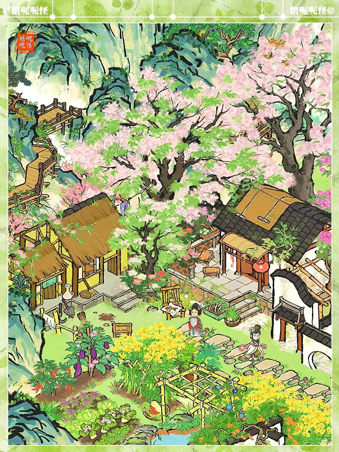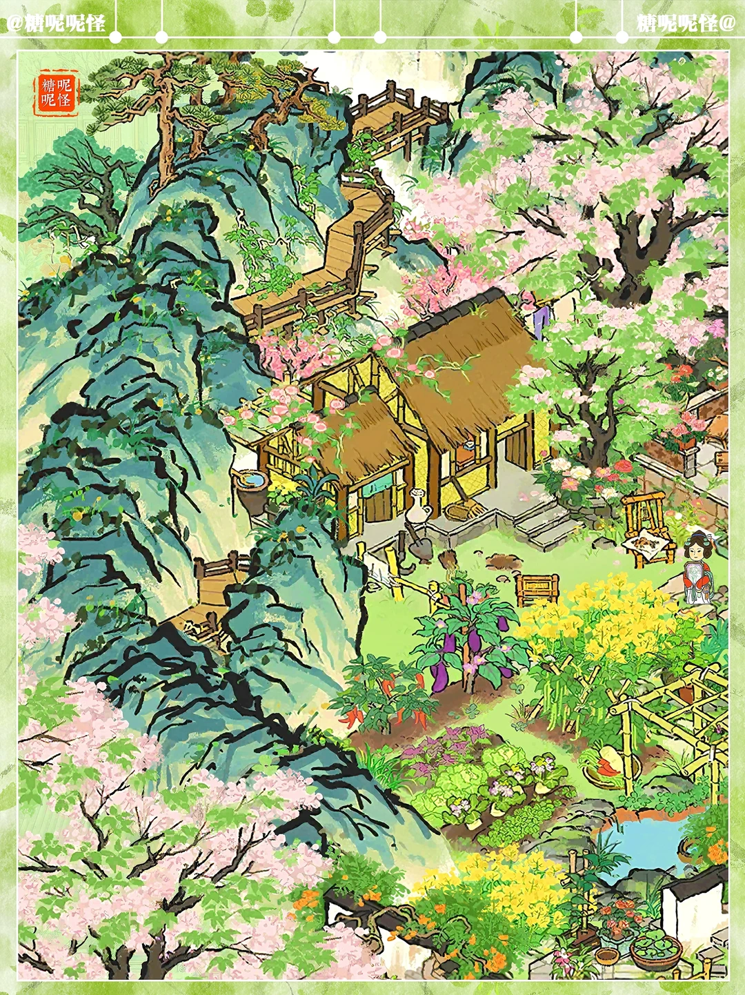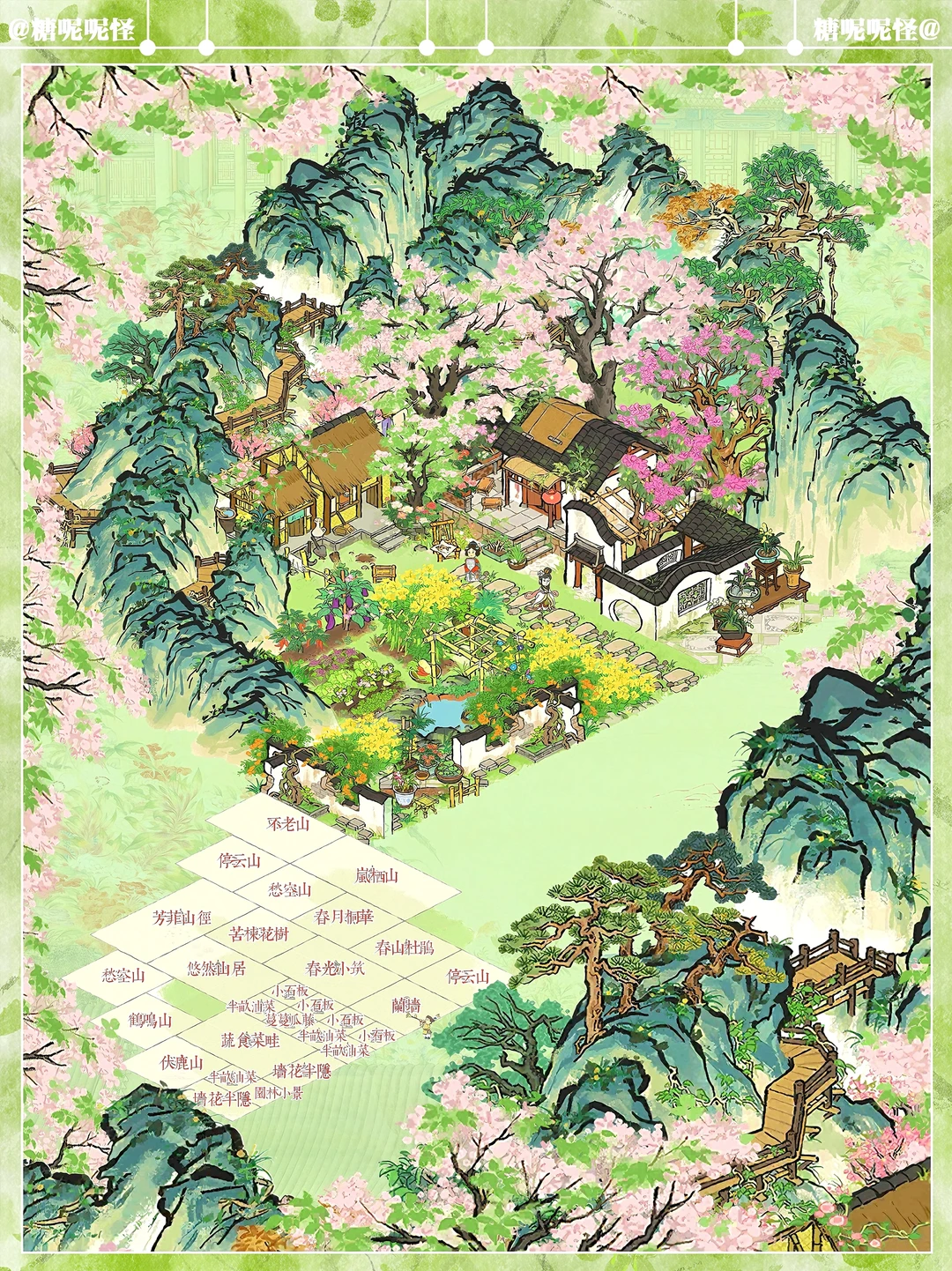 🌸苦楝花树+悠然山居布局 🌸建筑:苦楝花树|悠然山居|芳菲山径|春光小筑|春山杜鹃|春月桐华|愁空山|鹤鸣山|伏鹿山|停云山|岚栖山|蔬食菜畦|墙花半隐