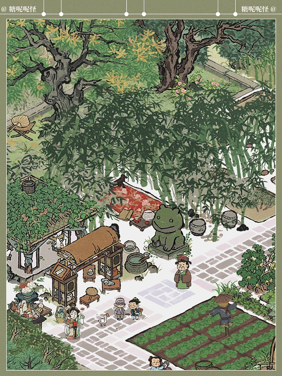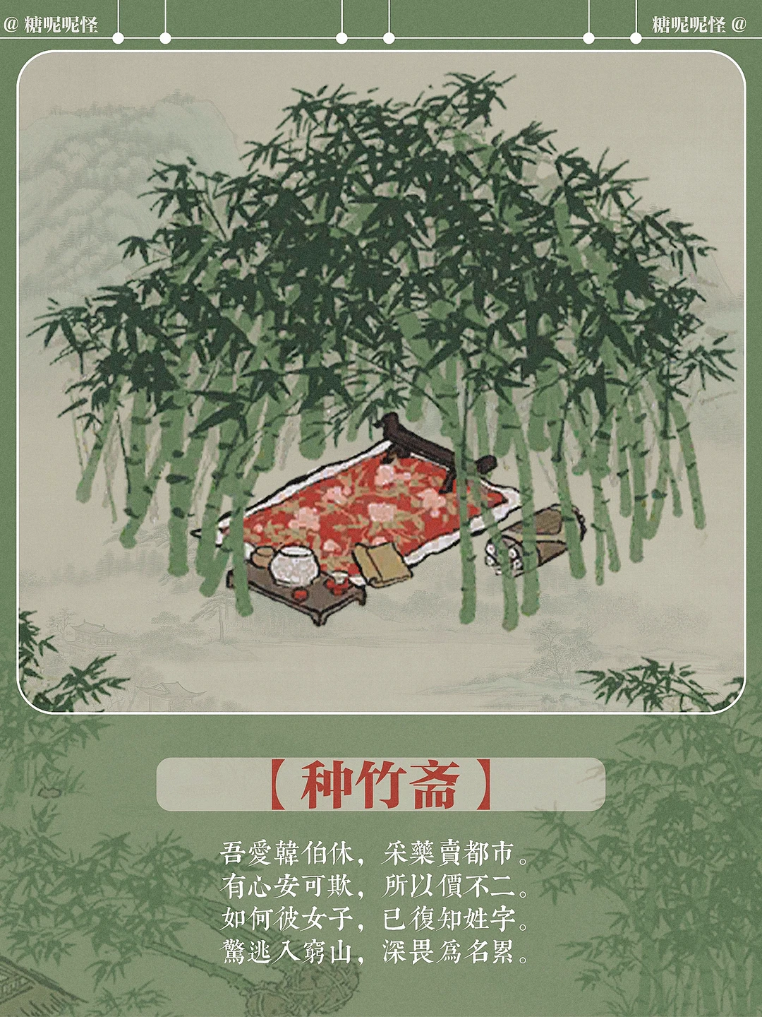 江南百景图建筑原型【第131】-【种竹斋】 桃花村建筑种竹斋的原型来自明代《司马光归隐图》 作为北宋熙宁变法的主要反对者,司马光在政治生涯遭受到严重挫折之下,毅然辞官归隐洛阳,营园著书一十三载,完成了千古帝师之书《资治通鉴》的编撰……也成就了独乐园千载不变的名声,使其成为中国园林史上少有的"以人名园"的典范。图中所绘正是司马光在独乐园中竹林休憩的场景。