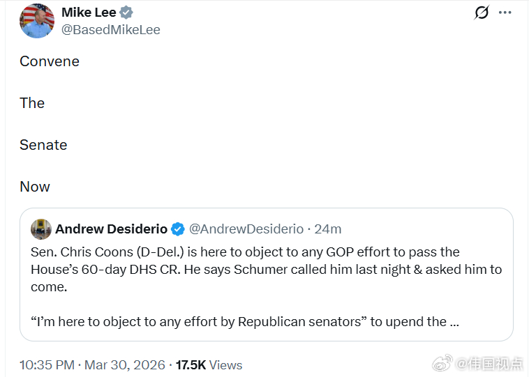 参议员迈克·李喊话:“立即召集参议院!”