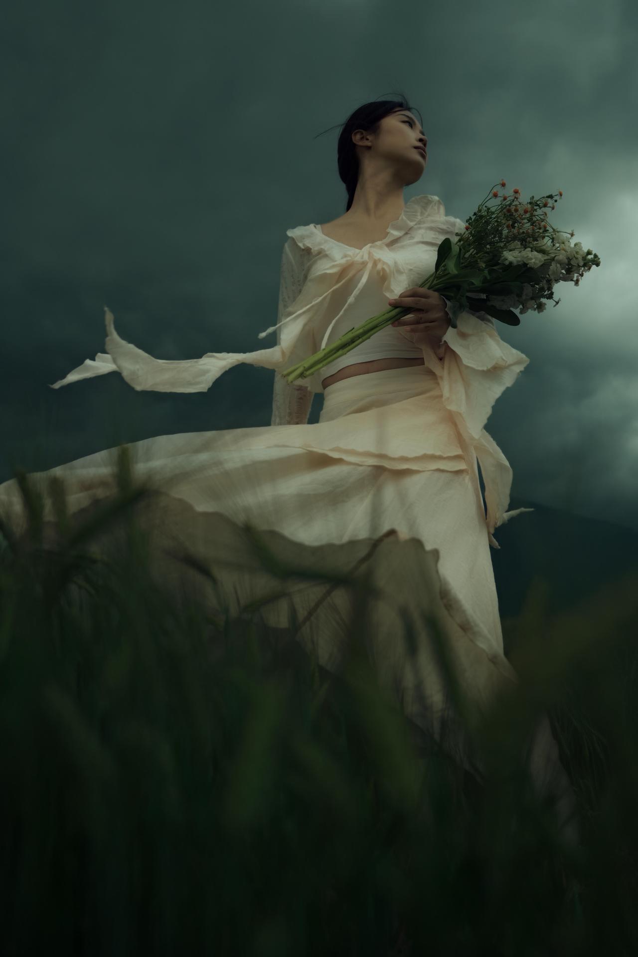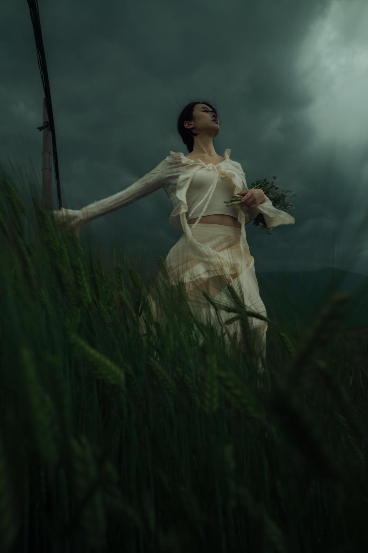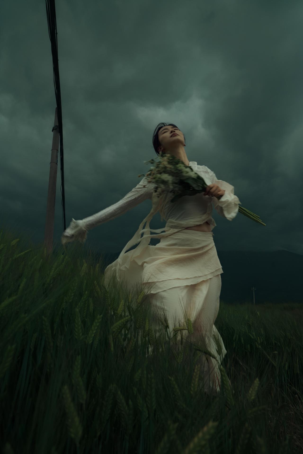 有时候,我们外出人像创作,在于拿到一些“反差感”:象征希望与生机的花束,与压抑沉郁的自然环境形成对抗,暗合悲伤中仍存一丝倔强的情绪内核。摄影师刻意让花束成为视觉锚点,无论是抱于胸前、贴于脸颊,还是举过头顶,都让花束成为人物情绪的延伸,让“孤独”不再是纯粹的绝望,而是带着对美好的执念。 构图上,摄影师灵活运用了框架式构图与引导线:电线杆、麦浪的线条将视线引向人物,让主体在开阔的旷野中依然保持核心地位。色彩控制极为克制,低饱和度的青灰调贯穿始终,裙装的米白色既不跳脱,又能在暗调环境中勾勒出人物轮廓,避免了画面的沉闷。人物姿态多为仰头、舒展手臂,这种向上的肢体语言与低垂的云层形成对抗,传递出在孤独中试图挣脱的力量感。 美中不足的是,部分画面中人物与环境的比例稍显失衡,若能适当缩小人物在画面中的占比,更能凸显旷野的辽阔与个体的孤独感。但整体来看,这组作品用细腻的视觉语言,将悲伤与倔强、孤独与希望交织,完成了一次有深度的情绪表达。