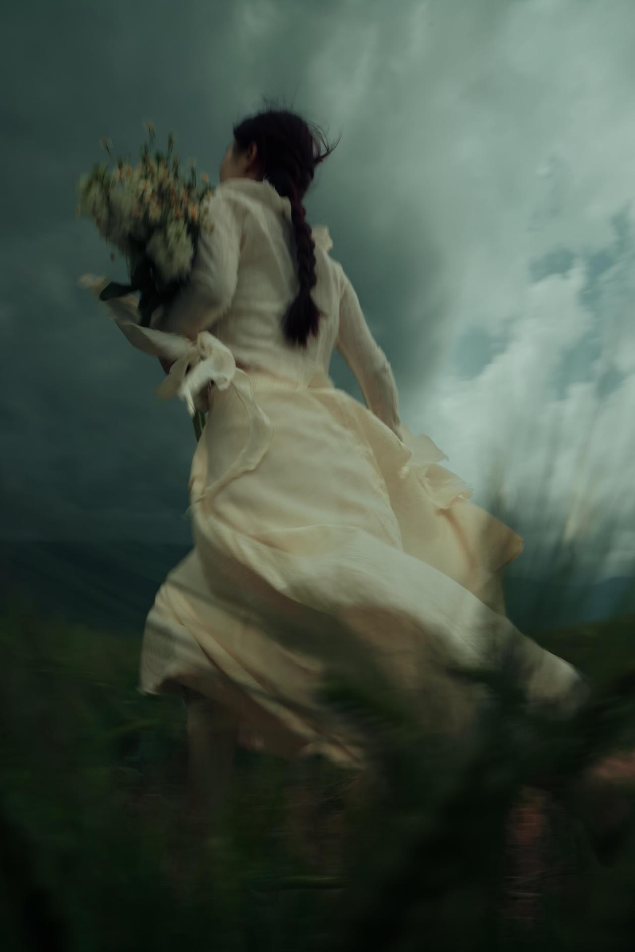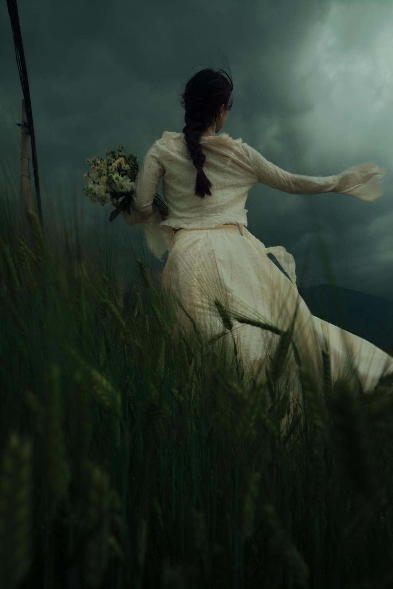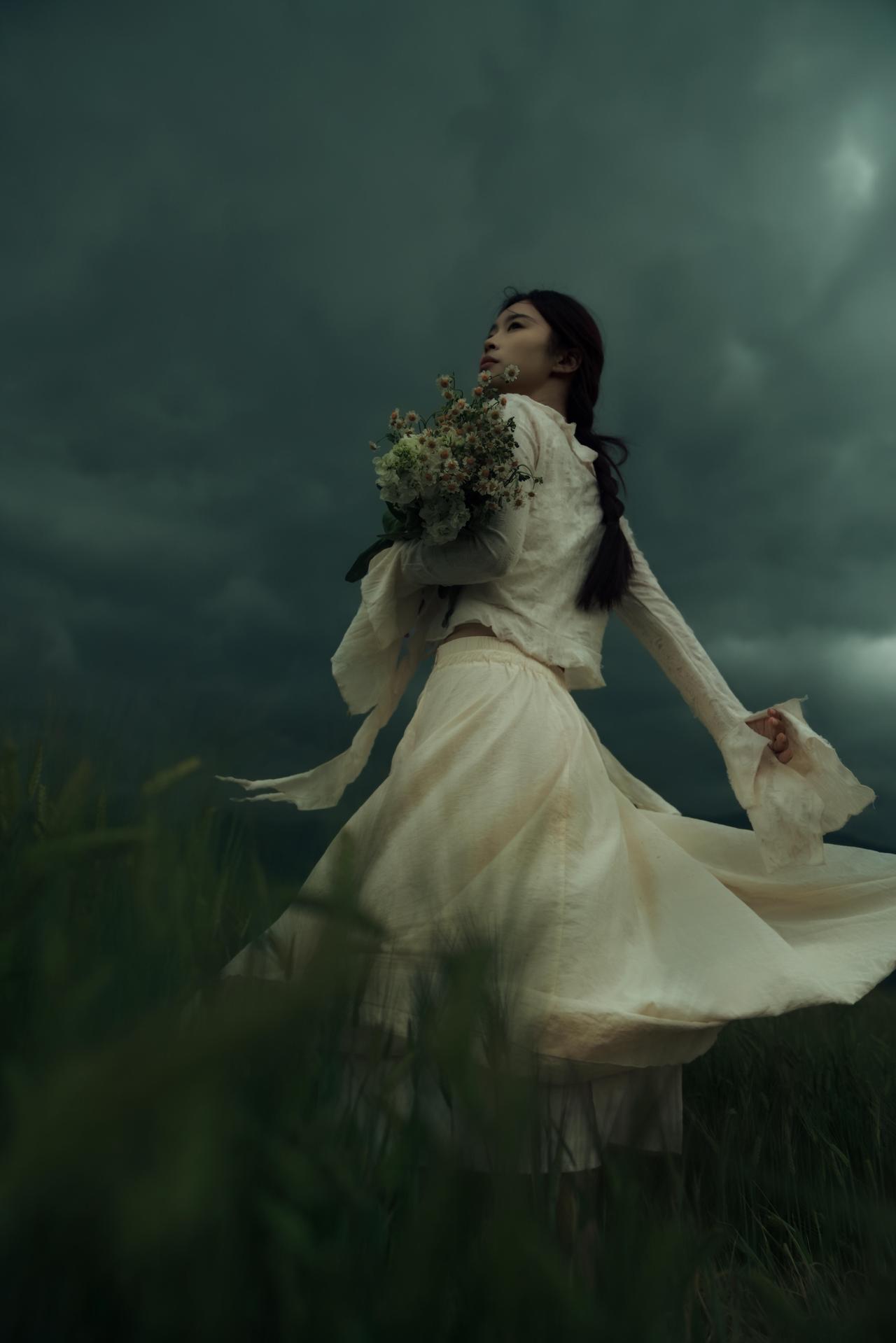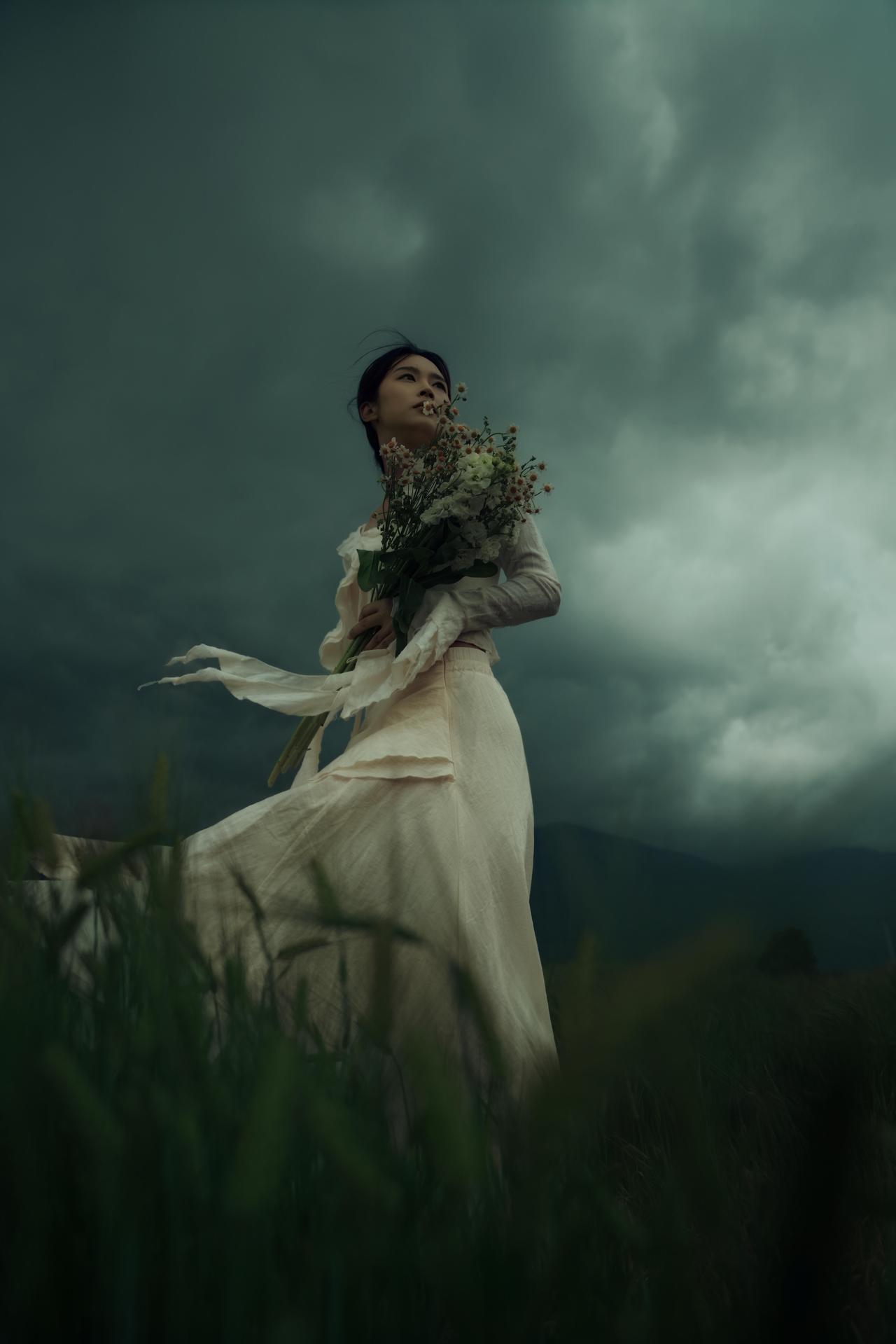 有时候,我们外出人像创作,在于拿到一些“反差感”:象征希望与生机的花束,与压抑沉郁的自然环境形成对抗,暗合悲伤中仍存一丝倔强的情绪内核。摄影师刻意让花束成为视觉锚点,无论是抱于胸前、贴于脸颊,还是举过头顶,都让花束成为人物情绪的延伸,让“孤独”不再是纯粹的绝望,而是带着对美好的执念。 构图上,摄影师灵活运用了框架式构图与引导线:电线杆、麦浪的线条将视线引向人物,让主体在开阔的旷野中依然保持核心地位。色彩控制极为克制,低饱和度的青灰调贯穿始终,裙装的米白色既不跳脱,又能在暗调环境中勾勒出人物轮廓,避免了画面的沉闷。人物姿态多为仰头、舒展手臂,这种向上的肢体语言与低垂的云层形成对抗,传递出在孤独中试图挣脱的力量感。 美中不足的是,部分画面中人物与环境的比例稍显失衡,若能适当缩小人物在画面中的占比,更能凸显旷野的辽阔与个体的孤独感。但整体来看,这组作品用细腻的视觉语言,将悲伤与倔强、孤独与希望交织,完成了一次有深度的情绪表达。