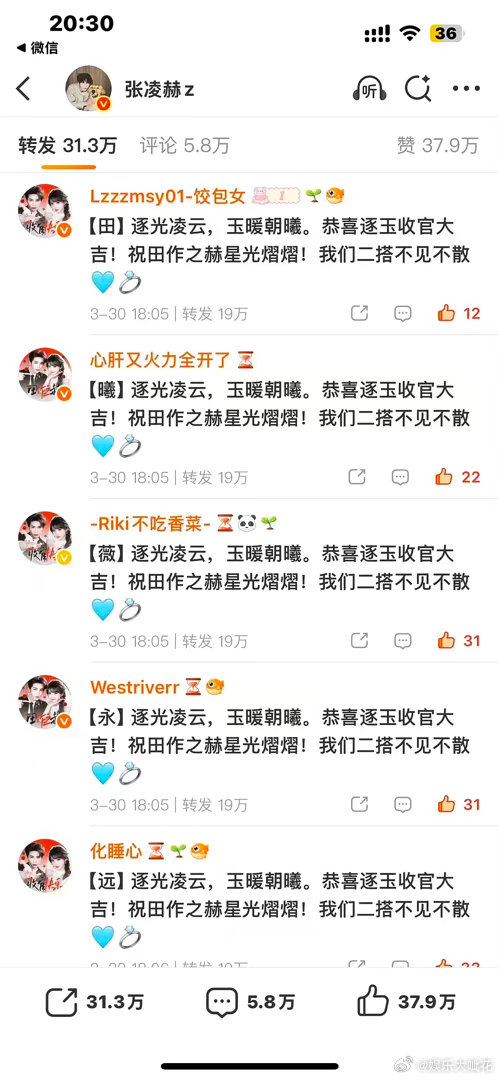 张凌赫《逐玉》最新杀青博转发区全是cp粉,而且20w转发算很高的水平了吧?这是真火到了下沉市场吗