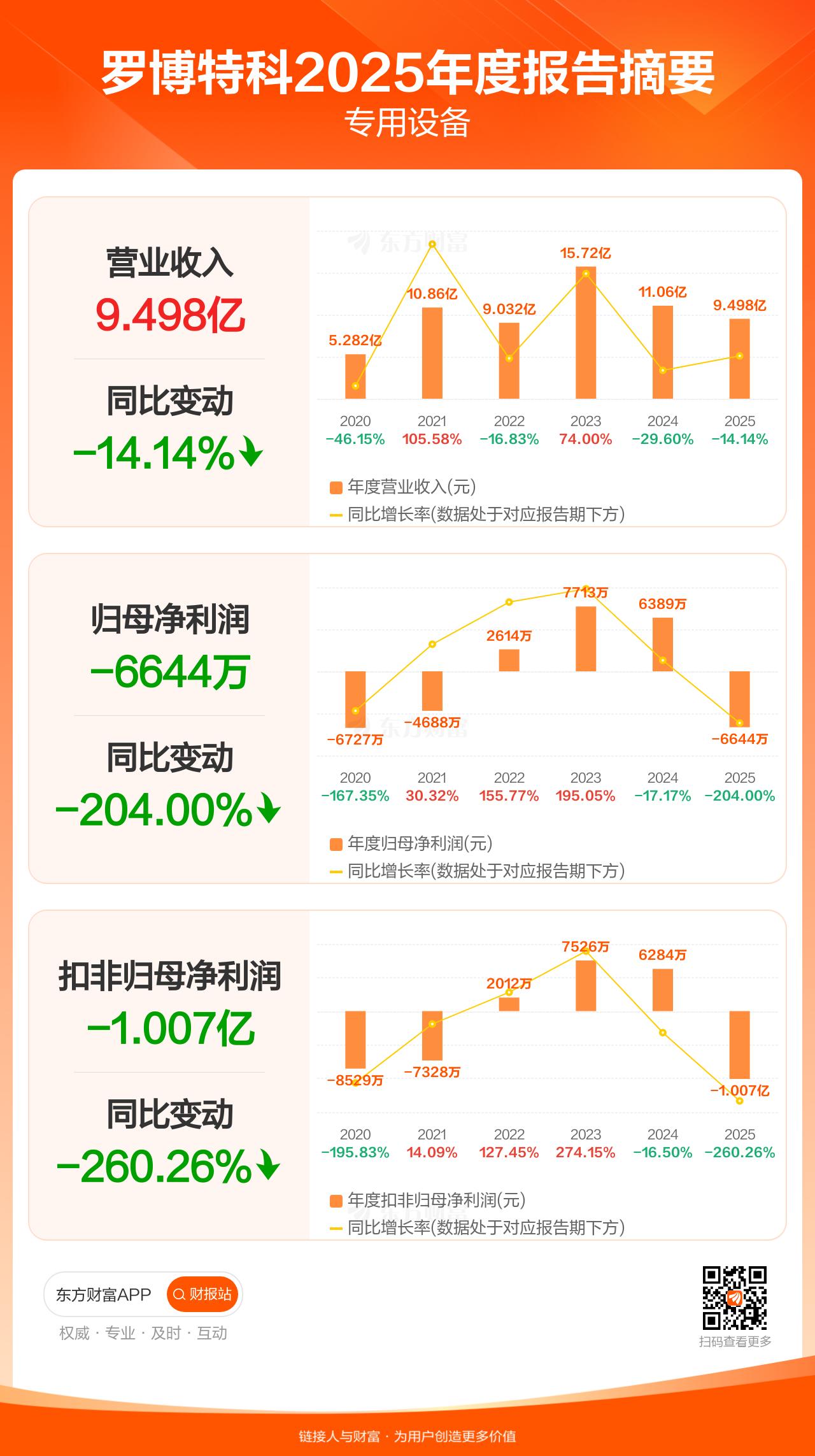 罗博特科3月31日发布2025年年报显示,公司全年实现营业收入9.50亿元,同比下滑14.14%;归母净利润-6644.04万元;扣非归母净利润-1.01亿元。每股EPS-0.41元,低于机构一致预测的0.30元。