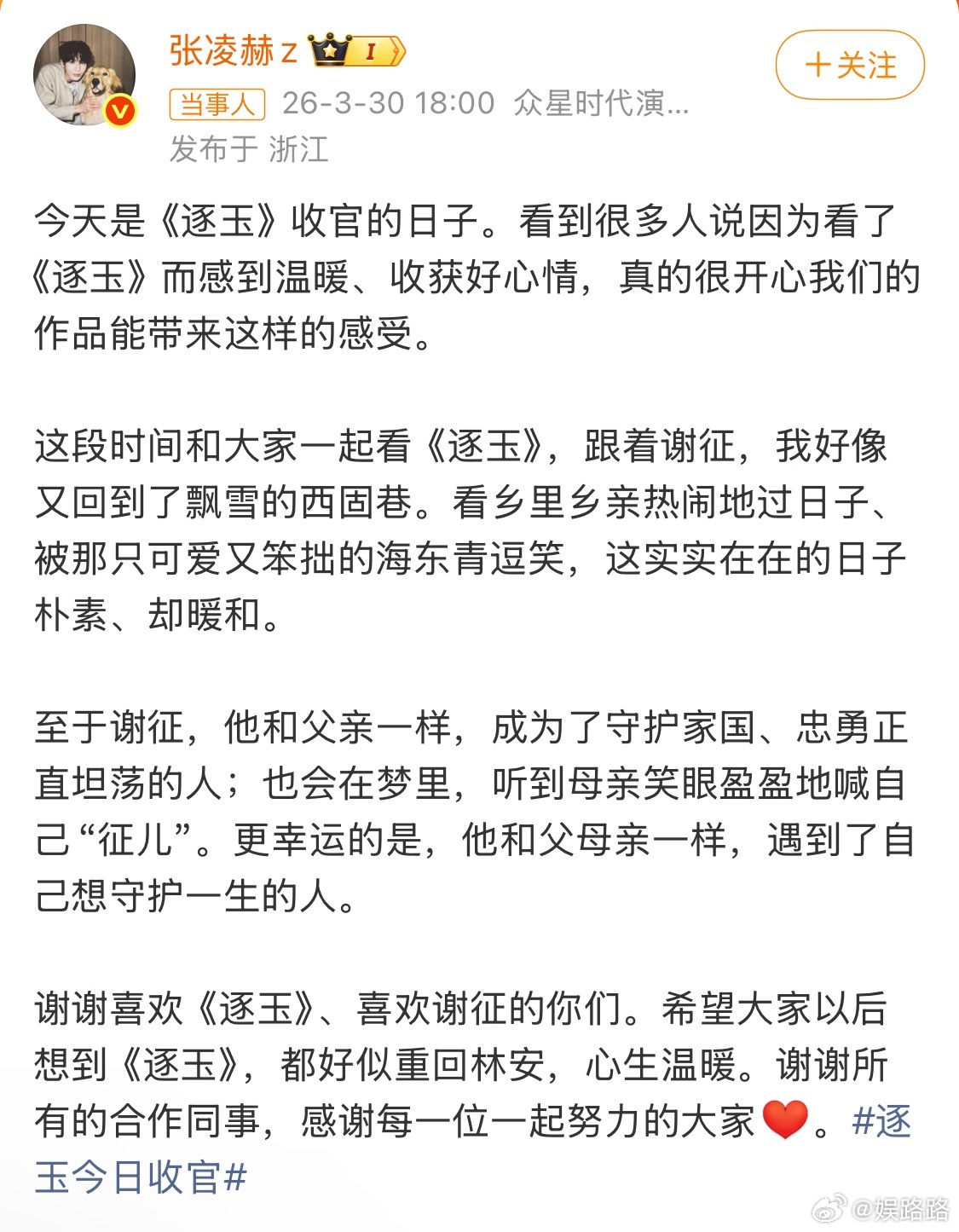 谢谢《逐玉》陪我们走过这段日子,也谢谢张凌赫,把谢征这么好的角色带给我们✨