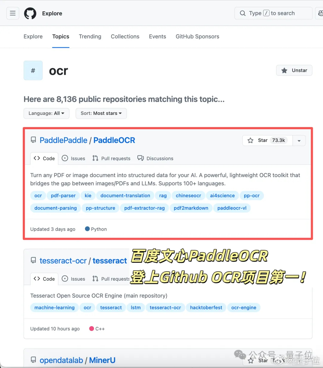 百度文心衍生模型PaddleOCR以73300+Star,正式登顶GitHub全球OCR项目榜,终结谷歌Tesseract OCR长期霸榜局面。