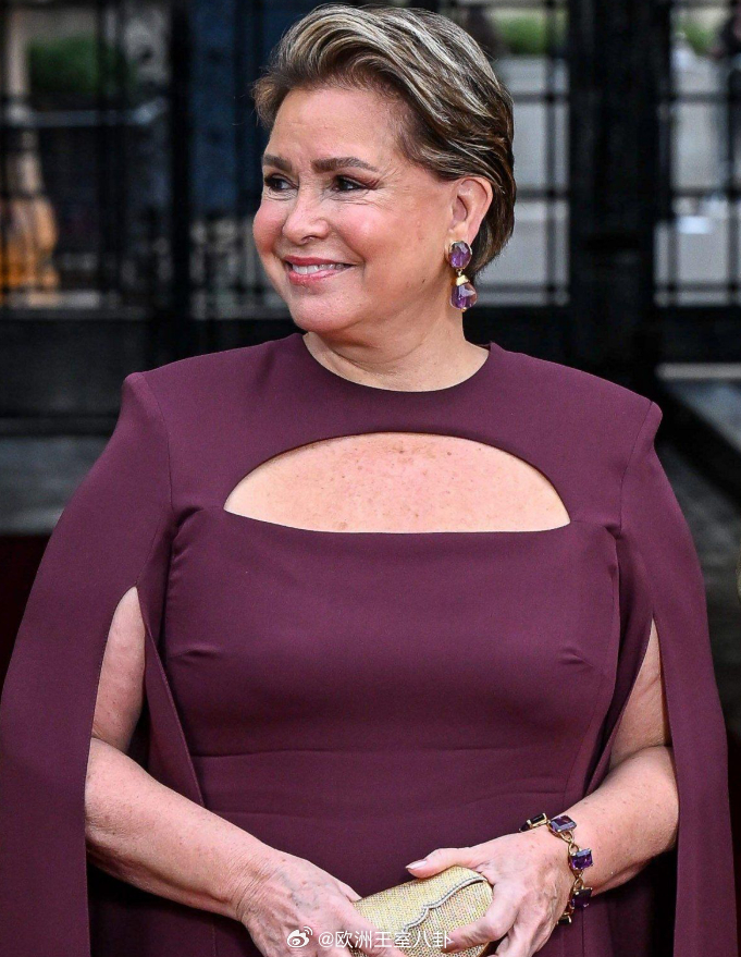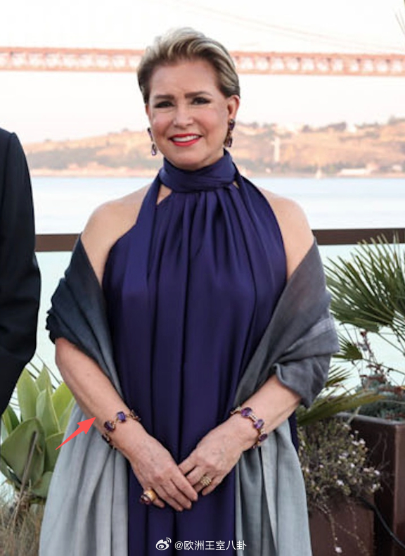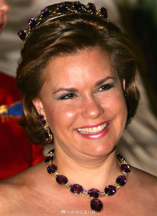 珠宝 卢森堡玛利亚-特蕾莎大公夫人的紫水晶手链,具体来源不明,一个猜测新千年后自行购入。粗略看就是黄金镶嵌的方块紫水晶,似乎并没有带钻的点缀,风格上跟MT近十来年的霸总风颇为般配。不过瓜路最早见到是MT拿来强行伪王冠,那叫一个乌漆嘛黑,当回手链正常多了(另一套紫水晶是拿骚家老货)