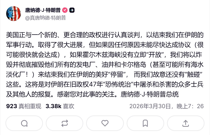 特朗普威胁摧毁伊朗发电厂油井和海水淡化厂——美国总统在其社交媒体发文:美国正与一