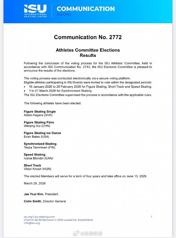 6月履新!隋文静当选国际滑联运动员委员会委员 3月30日,国际滑联公布运动员委员会委员竞选结果,中国花样滑冰运动员隋文静当选国际滑联运动员委员会委员,任期为四年,将于2026年6月13日正式履职。隋文静在接受北京青年报记者采访时表示,未来希望将更多中国声音传向世界,让世界看到中国运动员的风貌。 隋文静和韩聪是2018年平昌冬奥会亚军、2022年北京冬奥会冠军,也是两届世锦赛冠军。北京冬奥会后,中国双人滑项目面临新老交替的困境,2025年世锦赛甚至未能获得参赛资格。进入米兰冬奥周期最后一年,这对老将选择再度携手重返冰场。今年隋文静第三次参加冬奥会,在米兰冬奥会双人滑自由滑比赛中,隋文静/韩聪将《只此青绿》这套蕴含浓厚东方美学的节目演绎得气势恢宏又扣人心弦,他们最终名列第五。 今年1月15日,国际滑联公布了运动员委员会委员候选人名单,中国短道速滑奥运冠军武大靖以及花样滑冰奥运冠军隋文静在列。最终,在30日公布的入选名单中,花样滑冰单人、花样滑冰双人、花样滑冰冰舞、花样滑冰队列滑、速度滑冰与短道速滑六个项目,分别有1人入选,隋文静代表花样滑冰双人滑进入国际滑联运动员委员会。 在此前公示的竞选宣言中,隋文静曾表示,如果有幸当选委员,将重点推进三项核心工作。第一,传递真实的运动员声音。将我从训练伤病到职业转型的亲身经历,转化为沟通桥梁,回应运动员在规则公平、伤病保护以及退役转型等方面的迫切需求;第二,推动经验传承。分享我在“大满贯”征程中积累的技术与心理调整经验,并结合科研成果,助力全球年轻运动员成长;第三,促进文化融合。以花样滑冰为纽带,通过体育舞台让更多民族文化元素被看见,同时搭建不同项目运动员之间的交流平台。 在得知自己当选的消息后,隋文静难掩内心激动。这份来自国际体育组织的认可,在她看来,不仅是一份崇高的荣誉,更是一份沉甸甸的责任。“刚刚得知当选消息内心非常激动,这是世界各国运动员对我的支持和肯定,未来希望将更多中国声音传向世界,让世界看到中国运动员的风貌。”她说。 作为北京体育大学的教师,隋文静始终没有忘记教书育人的初心。她坦言:“我希望在国际组织看到的、学到的,更多传递给学生们,让更多学生了解国际动态,获得成长。” 文/北京青年报记者 周学帅