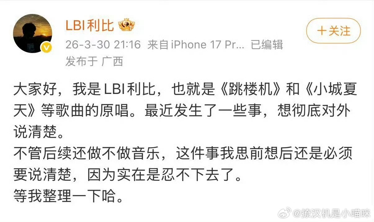 跳楼机原唱实在是忍不下去了🎤 独立音乐人LBI利比手撕环球音乐!资本霸凌、版权掠夺全曝光!谁还没被《小城夏天》《跳楼机》洗脑过?原唱LBI利比深夜炸场,把环球音乐中国的“资本套路”扒得底朝天! 💥 事件核心梳理1. 版权被侵:2025年发行EP《比时,此刻》,除《冷空气》外词曲版权全在利比手中,环球却强行主张母带权利与上架授权,还拿“沟通函”威胁。