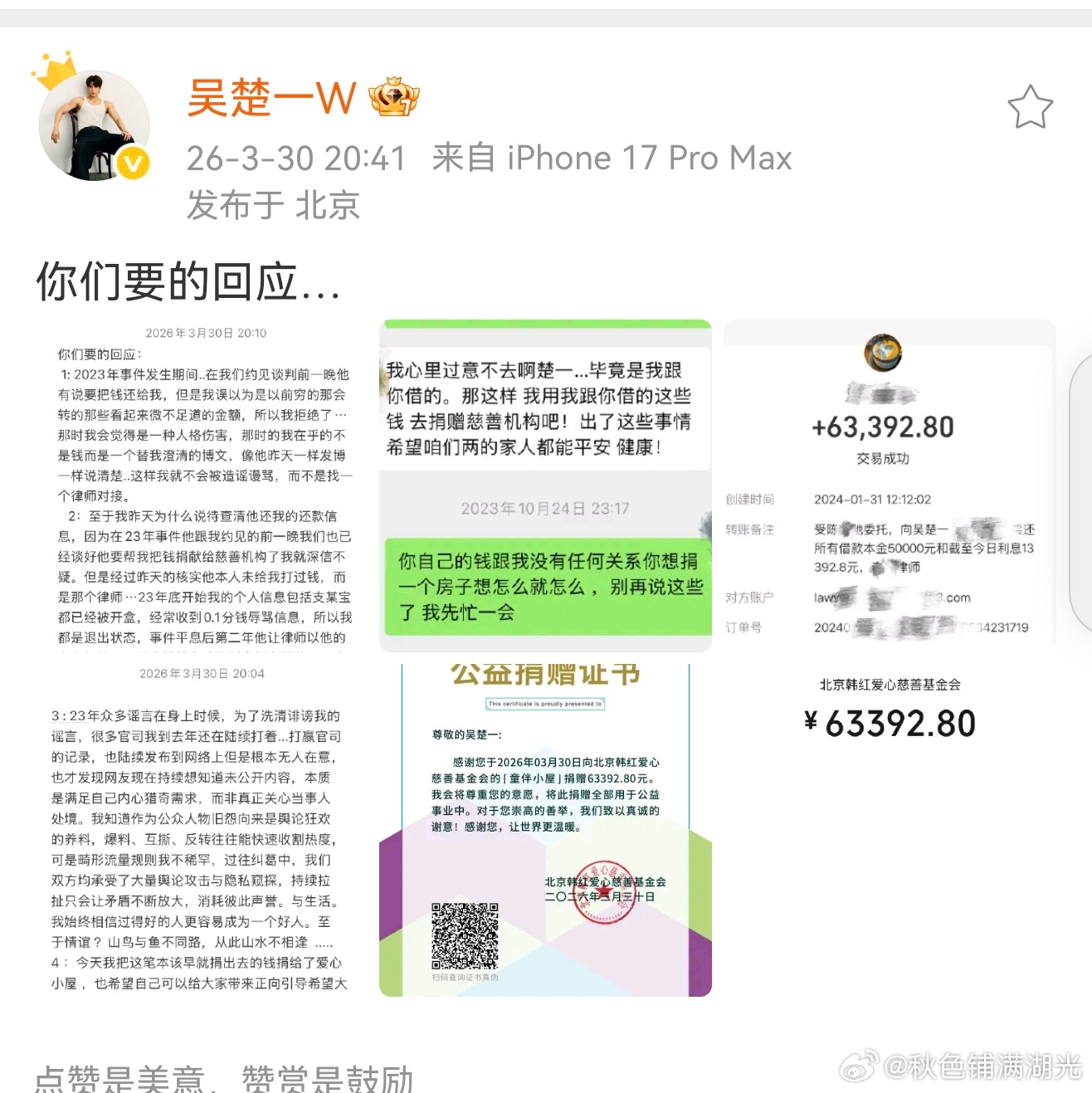 吴楚一把陈牧驰还的钱捐了因为吴楚一被网络骚扰困扰支付宝一直下线,所以昨天看到陈牧驰的截图去查账才发现陈牧驰早在2024年就把钱还给他了。吴楚一选择把这笔钱捐出去做公益了。