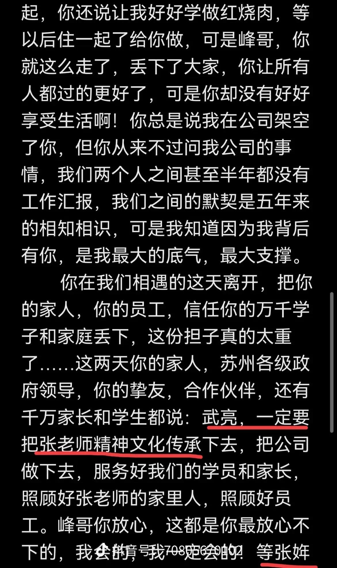 张雪峰老师头七,峰学蔚来总经理武亮老师发文缅怀张雪峰! 武亮老师在文中表示会继承张雪峰老师的精神,把公司做下去。等张姩菡长大了,会把担子传递给她,相信她会做的更好。 据了解,武亮老师从银川基层做起,一步一步成长为峰学蔚来总经理。 张雪峰生前和武亮亦师亦友,相信他能把峰学蔚来的场面撑下去。