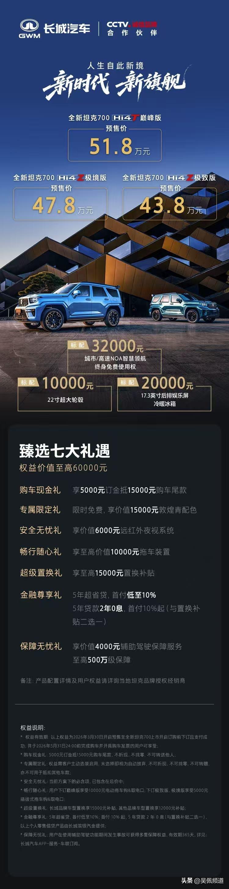 更新了外观(更霸气了)、加了吸顶屏(增程/纯电有的我也有),Hi4-T依然是V6……坦克700发新款预售价了。 不管你是爱上网还是不爱上网,或者你是燃油车还是新能源车车迷,我觉得你都能在坦克700上面找到闪光点了。