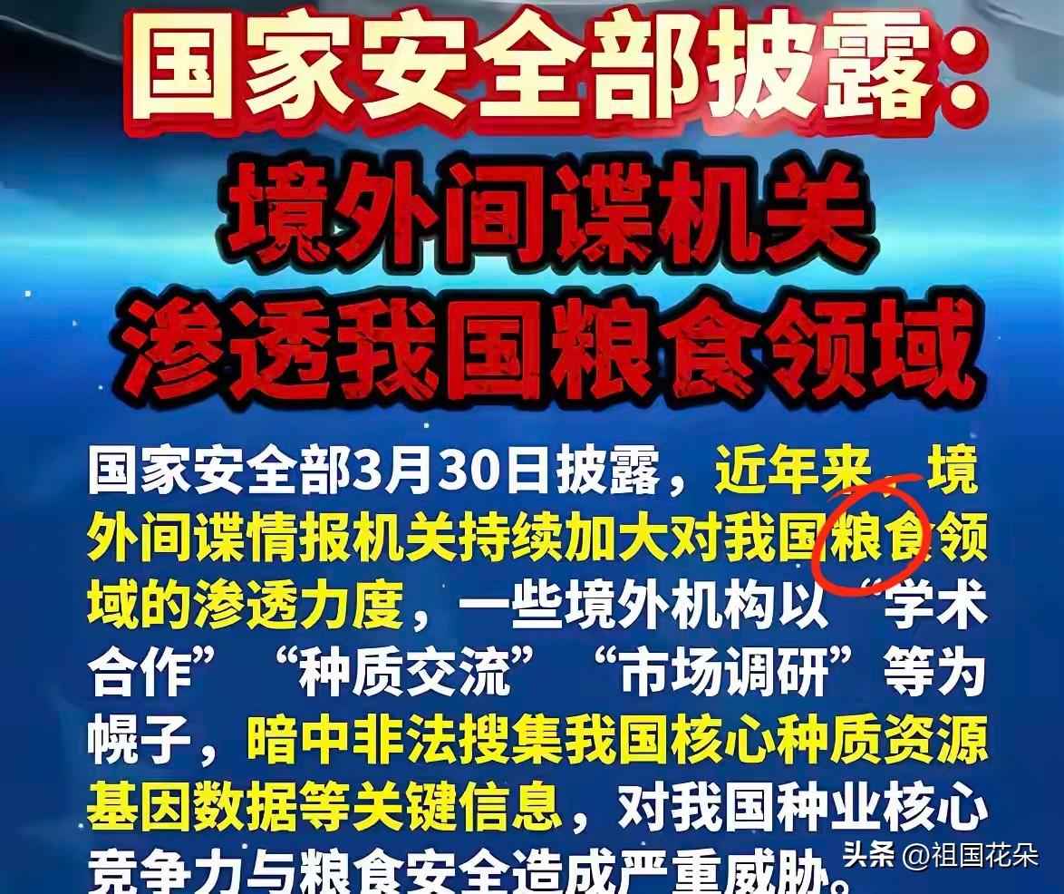 国外间谍无孔不入!!! 刚刚看到一条新闻: 国家安全部3月30日发文,境外间谍机关渗透我国粮食领域窃取种质资源基因数据库。 一些境外机构以“学术合作”“种质交流”市场调研”等为幌子,暗中非法搜集我国核心种质资源基因数据等关键信息。 种质资源就是农业的“芯片”,是我们饭碗的根,更是国家的战略命脉。一粒种子、一组基因,背后都是几代科研人的心血,绝不能被外人轻易窃取。 这些境外势力手段极其隐蔽,披着光鲜外衣,实则步步为营。他们用合作当诱饵,用调研做掩护,目标直指我们最核心的种质基因库。 我国拥有52万份农作物种质资源,位居世界第二,这是我们独有的农业宝库。一旦基因数据泄露,等于把育种主动权拱手让人。 此前已有案例曝光,有人被高额利益诱惑,违规出售杂交水稻亲本种子,最终锒铛入狱。惨痛教训就在眼前,警钟必须长鸣。 粮食安全容不得半点侥幸。间谍渗透早已不是遥远的故事,而是发生在科研院所、田间地头的真实威胁。 国家安全机关重拳出击,破获多起窃密案件,斩断黑手、消除隐患,守住了我们粮食安全的底线。 守护种质资源,不只是国家部门的责任,更是每个中国人的义务。遇到可疑合作、高价收种,一定要提高警惕。 12339是国家安全举报电话,发现线索及时上报,人人都是防线,才能筑牢粮食安全的铜墙铁壁。 饭碗必须牢牢端在自己手里,种子安全更是重中之重。任何觊觎我国核心资源的图谋,都必将付出沉重代价。 各位读者你们怎么看?欢迎在评论区讨论。