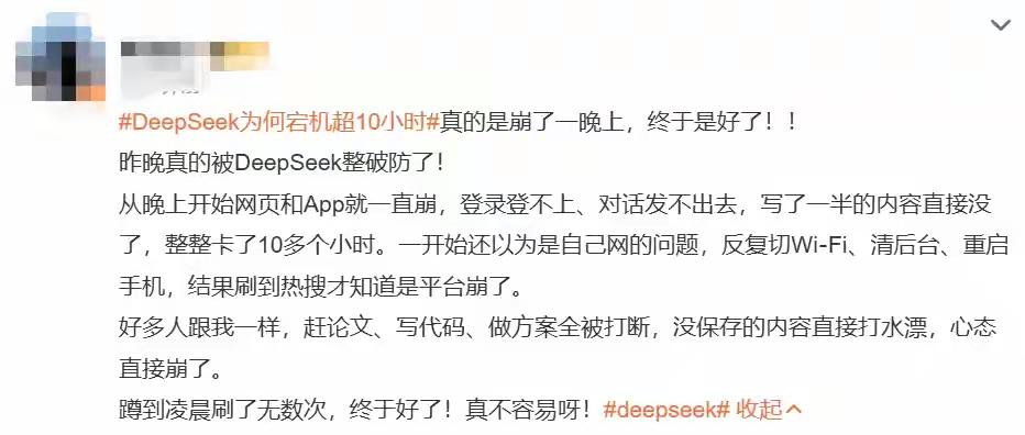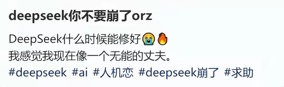 深夜瘫痪12小时!千万打工人集体破防:没了AI,我的PPT代码论文全泡汤了! (来源:新闻晨报陆靖珺综合IT之家) 昨晚九点半开始,无数人的屏幕突然陷入沉默——DeepSeek页面卡顿、服务器繁忙的提示像一道冰冷的墙,把赶工的学生、加班的程序员、熬夜写方案的职场人拦在了截止日期前。有人反复刷新到凌晨,有人急得摔键盘:“写了一半的论文没保存,AI一崩,我的脑子也跟着崩了!” 这场持续近12小时的中断,暴露了AI时代一个扎心真相:我们早已习惯把思维外包给机器。当DeepSeek停止回应,许多人才惊觉自己竟像突然断电的机器人,对着空白文档手足无措。有网友自嘲:“我像个无能的丈夫,离了AI连周报都编不出来。” 但崩溃的背后,其实是技术依赖与人性韧性的碰撞。有人切到其他AI工具继续奋战,有人翻出积灰的笔记本手写提纲。短暂的“数字戒断”反而让一些人找回了原始创造力:原来没有AI催稿,自己也能憋出几个灵光一闪的句子。 这场意外更像一场社会实验:当技术暂时退场,人类是彻底瘫痪,还是被激发出更原始的潜能?评论区里,有人焦虑“没法上班了”,也有人冷静反思:“过度依赖AI,是否让我们遗忘了大脑本该有的弹性?” 值得庆幸的是,DeepSeek团队在凌晨紧急修复,清晨逐步恢复服务。但这场风波留下的余震未平——如果AI成为水电般的基础设施,它的稳定性是否该被赋予更高要求?当工具塑造了我们的工作节奏,人与技术的边界究竟在哪里? 或许,我们需要感谢这次宕机。它像一盆冷水,浇醒了沉浸在“AI万能梦”中的我们:技术是翅膀,但飞翔的力量终究来自自己的双臂。下次遇到卡顿,不妨深呼吸,试试用人类的智慧解决人类的问题。 毕竟,AI再强大,也是人类思维的延伸而非替代。在算法闪烁的间隙,那些属于我们的、笨拙却珍贵的思考,才是照亮未知的真正光芒。 AI依赖症 技术双刃剑