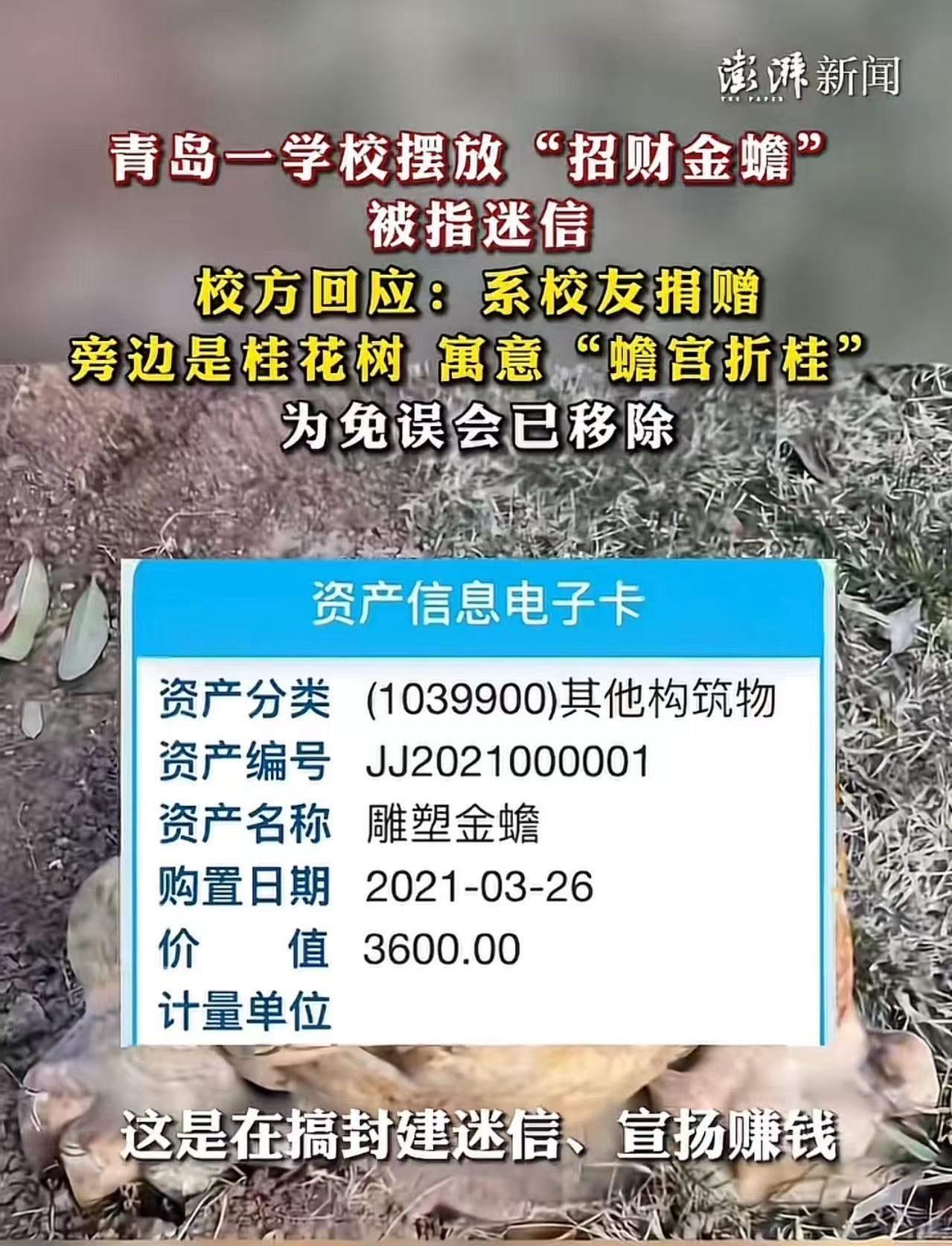 山东青岛,一学校摆放招财金蟾被指迷信!举报人:“金蟾正对校长室窗户,这是在搞封建