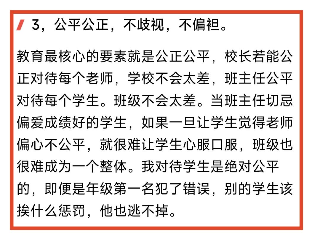 当了23年班主任23年孩子王,也算经历了教育的风风雨雨。如果要问我班级管理最核心的要素是什么,我一定会把“公平公正”这四个字排在第一位。不偏袒成绩好的学生,不歧视成绩差的学生,这是我长期坚持的基本原则。如果学生明显感到班主任处事不公平,厚此薄彼,那么班级凝聚力基本上就散掉了,而一旦班级失去了凝聚力,班主任会非常的累。所以以前我曾经把年级前十名的学生罚到教室外面站,有老师对我说,这么好的学生你也忍心罚站?我还真没想过这个问题,因为她违纪了,跟她成绩好不好没有关系。老师坚持公平公正,在学生面前乃至学生家长面前说话就有底气,而这个底气,对于管理班级是非常重要的。还有一点,坚持公平公正,其实也会让班级同学之间的关系更融洽,凝聚力更强。教育