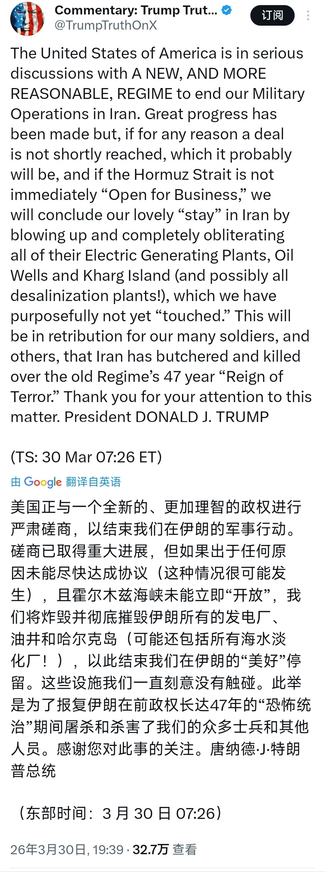 特朗普昨晚(北京时间3月30日晚)写道:“美国正与一个全新的、更加理智的政权进行严肃磋商,以结束我们在伊朗的军事行动。磋商已取得重大进展,但如果出于任何原因未能尽快达成协议(这种情况很可能发生),且霍尔木兹海峡未能立即‘开放’,我们将炸毁并彻底摧毁伊朗所有的发电厂,油井和哈尔克岛(可能还包括所有海水淡化厂!),以此结束我们在伊朗的‘美好’停留。这些设施我们一直刻意没有触碰。此举是为了报复伊朗在前政权长达47年的‘恐怖统治’期间屠杀和杀害了我们的众多士兵和其他人员。” [机智]评几句:特朗普针对伊朗的最新发文,将其一边吹牛撒谎、一边恫吓威胁的政客嘴脸暴露得淋漓尽致,通篇充斥着毫无底线的霸权蛮横与自相矛盾的虚伪说辞。特朗普先是大言不惭宣称美伊磋商取得重大进展,还妄谈所谓“全新、更加理智的政权”,这番表述完全是脱离现实的吹牛撒谎,所谓的磋商进展不过是其为自己造势的谎言,既无实质依据支撑,也未得到伊朗方面任何认可,纯粹是为了塑造自身所谓“强势外交”的虚假形象。而在吹牛的同时,他立刻露出恫吓威胁的狰狞面目,公然叫嚣要炸毁伊朗所有发电厂、油井、海水淡化厂等民生与能源核心设施,甚至用嘲讽的口吻提及在伊朗的“美好”停留,全然无视国际法准则与基本人道底线,将军事霸权与极端自私展现得一览无余。这种先靠谎言粉饰太平,再用暴力威胁逼迫妥协的做派,本质是无视他国主权、漠视生命权益的霸权行径,既暴露了其外交政策的荒诞无稽,也尽显其为达目的不择手段的卑劣本质,所谓的谈判磋商不过是威胁施压的幌子,从头到尾都是谎言与暴力的捆绑表演。