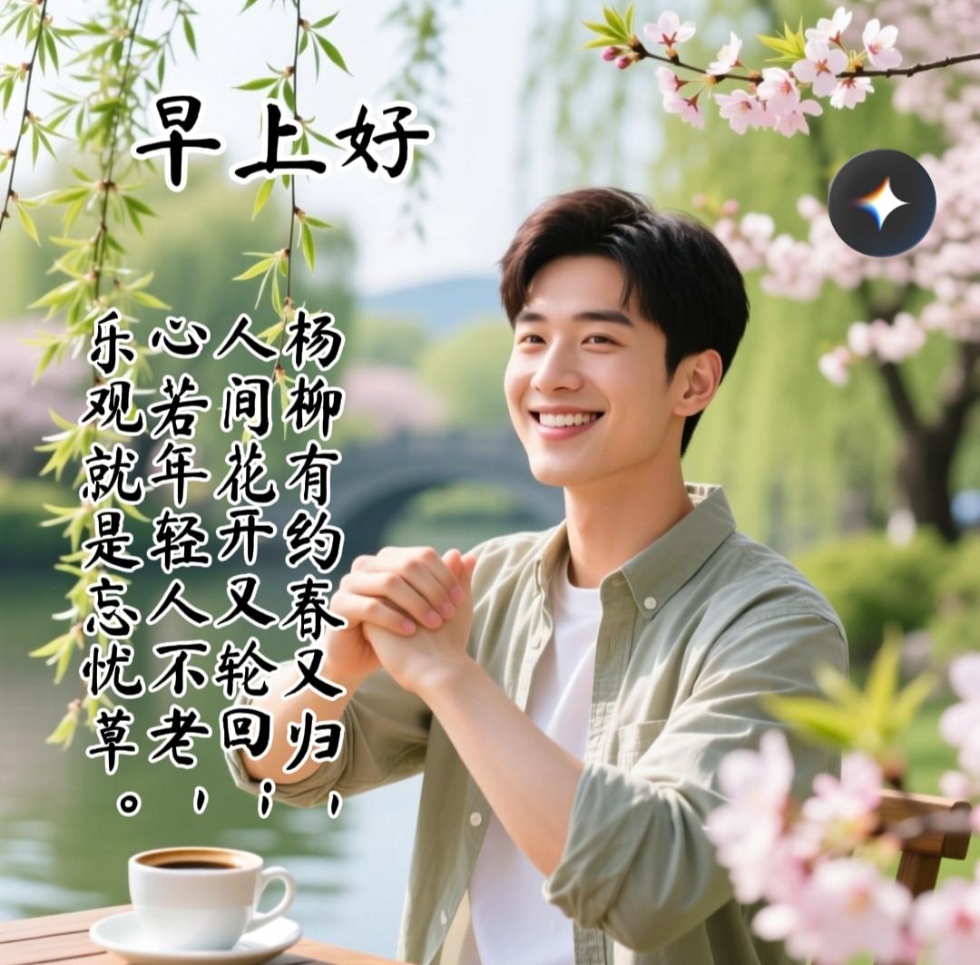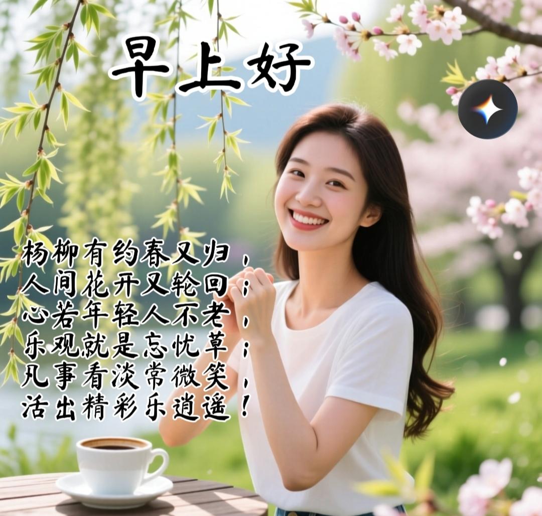 杨柳有约春又归, 人间花开又轮回; 心若年轻人不老, 乐观就是忘忧草; 凡事看淡常微笑, 活出精彩乐逍遥! 早上好![碰拳][咖啡]