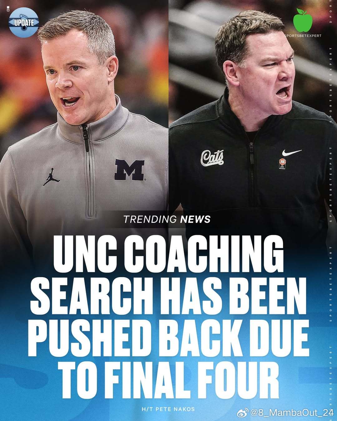 据Pete Nakos报道,北卡罗来纳大学的选帅工作因最终四强赛而推迟