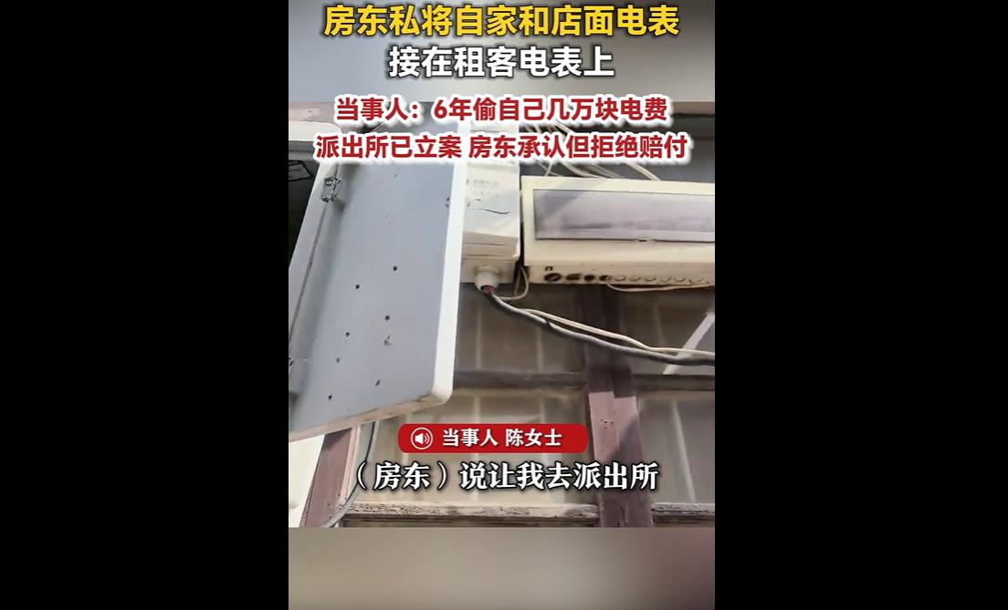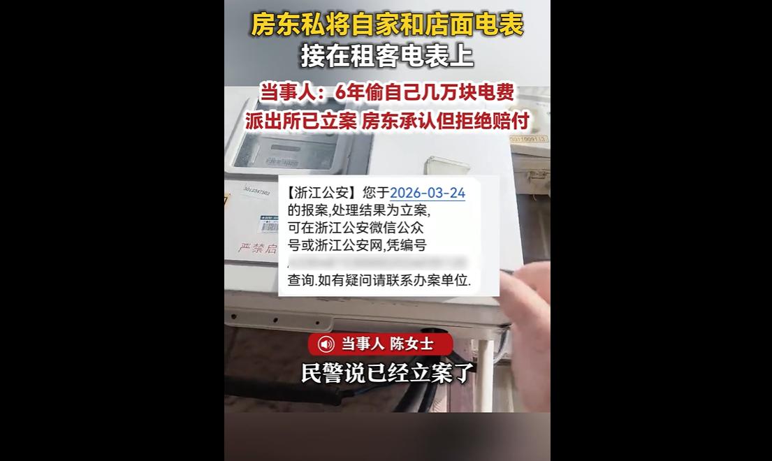 近日,浙江海宁陈女士发现,自己租房6年做生意,不知情下被房东将自家电表及其他租户电表接在其表上,累计交17万多电费,多交几万块。 然而,房东承认偷电却拒绝赔付,还要求陈女士到期搬走,并称撤案才愿协商,目前派出所已立案,房东被取保候审。 这几万块,是陈女士起早贪黑经营的辛苦所得,是日复一日的汗水积累,却被房东以不光彩的方式侵占,换谁都会心生委屈。 更令人无奈的是,房东在承认偷电事实后,不仅没有丝毫歉意,反而拒绝赔付,还要求陈女士到期搬走,甚至以“撤案才协商”相要挟,这份蛮横与不讲诚信,着实令人难以接受。 房东的行为,既违背了诚信原则,也涉嫌违法。 租房关系中,房东与租客本应是平等互利、相互尊重的关系,房东有义务保障租客的合法权益,而非利用自身优势,暗中侵占租客利益。 将自家电表及其他租户电表接在陈女士电表上,偷偷转嫁电费,这种行为不仅侵犯了陈女士的财产权,更是一种违法行为,如今派出所已立案、房东被取保候审,也体现了法律对违法行为的约束与惩戒,让我们看到了公平正义的底线。 这起事件,也暴露了租房市场中租客权益保护的薄弱环节。 很多租客在租房时,往往更关注租金、地段等因素,忽视了水电表核对、权益约定等细节,给了一些不诚信房东可乘之机。 陈女士6年才发现偷电问题,也反映出租客在日常租房中,对水电使用、费用缴纳的关注度不足,同时也提醒租客,租房时应注重细节,明确水电权责,定期核对水电表,及时发现问题、解决问题,避免自身权益受损。