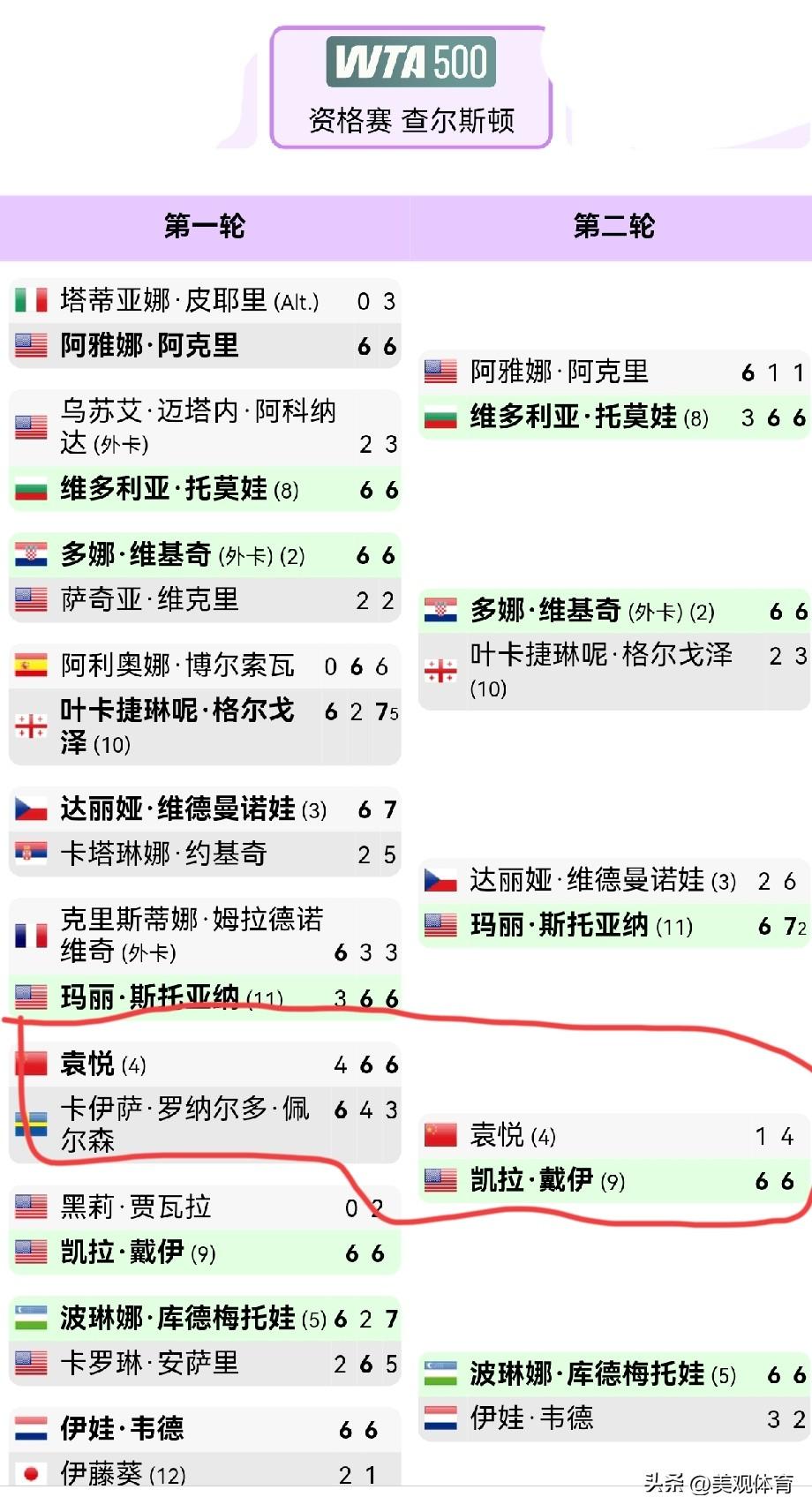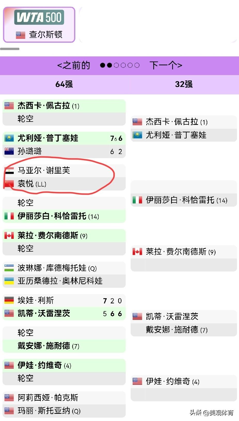 WTA500查尔斯顿:袁悦成为幸运落败者 在资格赛比赛中,袁悦险胜过了一关 但是资格赛第二轮输给了资格赛九号种子。 还好,正赛签表中有人退赛,袁悦得以成为幸运落败者,将出战战胜首轮。袁悦首轮对手是世界排名102的谢里夫。 袁悦或有获胜机会。