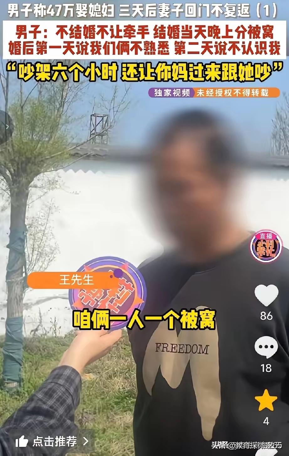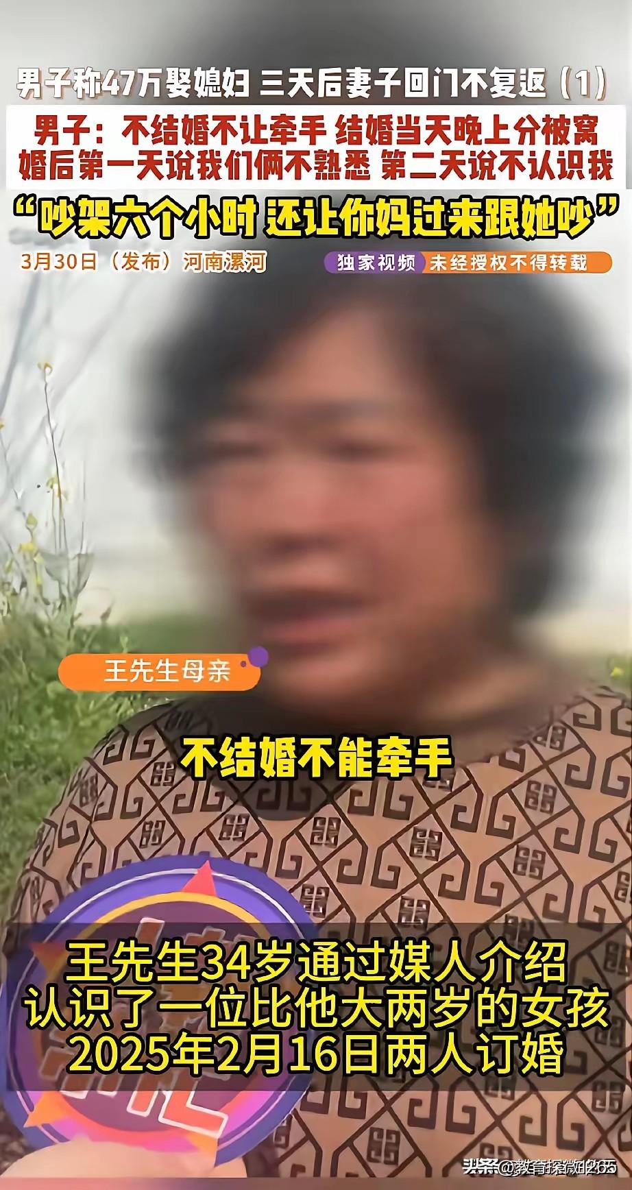 河南漯河34岁男子经介绍认识36岁女子,恋爱一年,女方以内向为由,始终拒绝牵手,称婚后才可亲密。男子倾尽家底,付40万彩礼,总花费47万办婚礼。新婚夜,岳母来电不让同房,两人分被窝,男子一碰被子就被说不熟悉。第二天女方竟说不认识他。第三天回门,岳父让女方去买菜,她就此失联不回。男方多次上门要人、讨要彩礼,女方反以男方砸门为由,同意离婚却不肯全退彩礼,村委调解无果 。 这就是男方掏心掏肺还花光家底娶媳妇,结果遇上了没诚意的人。谈了一年连手都不让牵,结婚就是走个过场,新婚夜不让碰、第二天不认人、第三天直接跑,明摆着不是真心过日子,更像是借着结婚捞钱,把人家的血汗钱当冤大头坑。 男方又生气又着急可以理解,但上门闹事解决不了问题,还落人口实。这种没一起生活、拿了彩礼就消失的,法律上本来就该退钱,直接走法律程序要回彩礼才最靠谱。 现在不少人把婚姻当生意,用高额彩礼卡人,最后坑的都是普通家庭。结婚是搭伙过日子,不是骗钱敛财,做人得讲良心,贪这点钱毁了名声,以后再也没人敢真心相待,得不偿失。