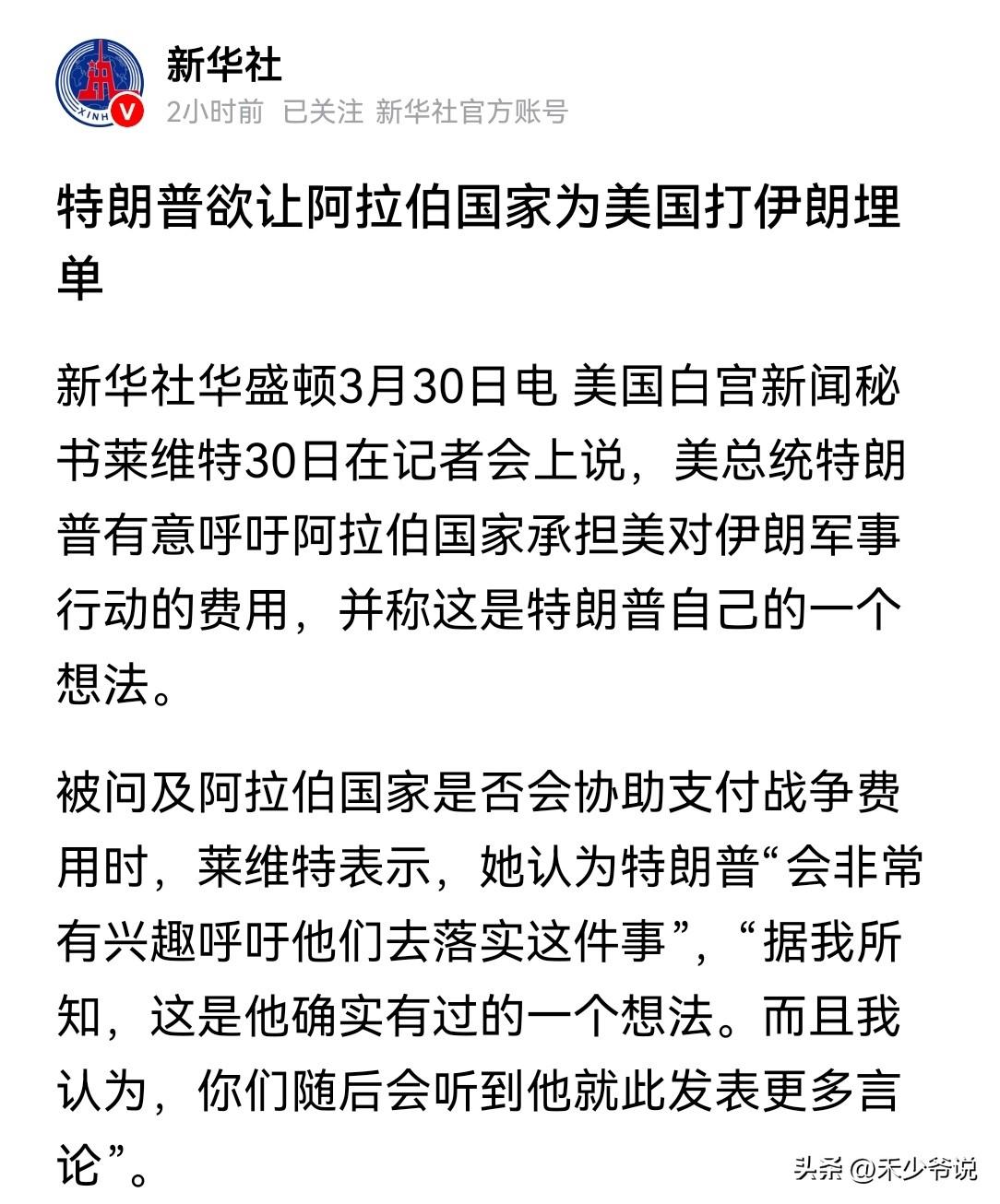 如果不是新华社报道的我都不敢相信 这真的是太魔幻了,特朗普真当阿拉伯国家还是“人傻钱多”呢?美国和以色列发起的与伊朗冲突,在冲突中阿拉伯国家受损,特朗普严重居然想着要阿拉伯国家为此次冲突埋单。如果不是新华社报道的我都以为是小道消息或者谣言。