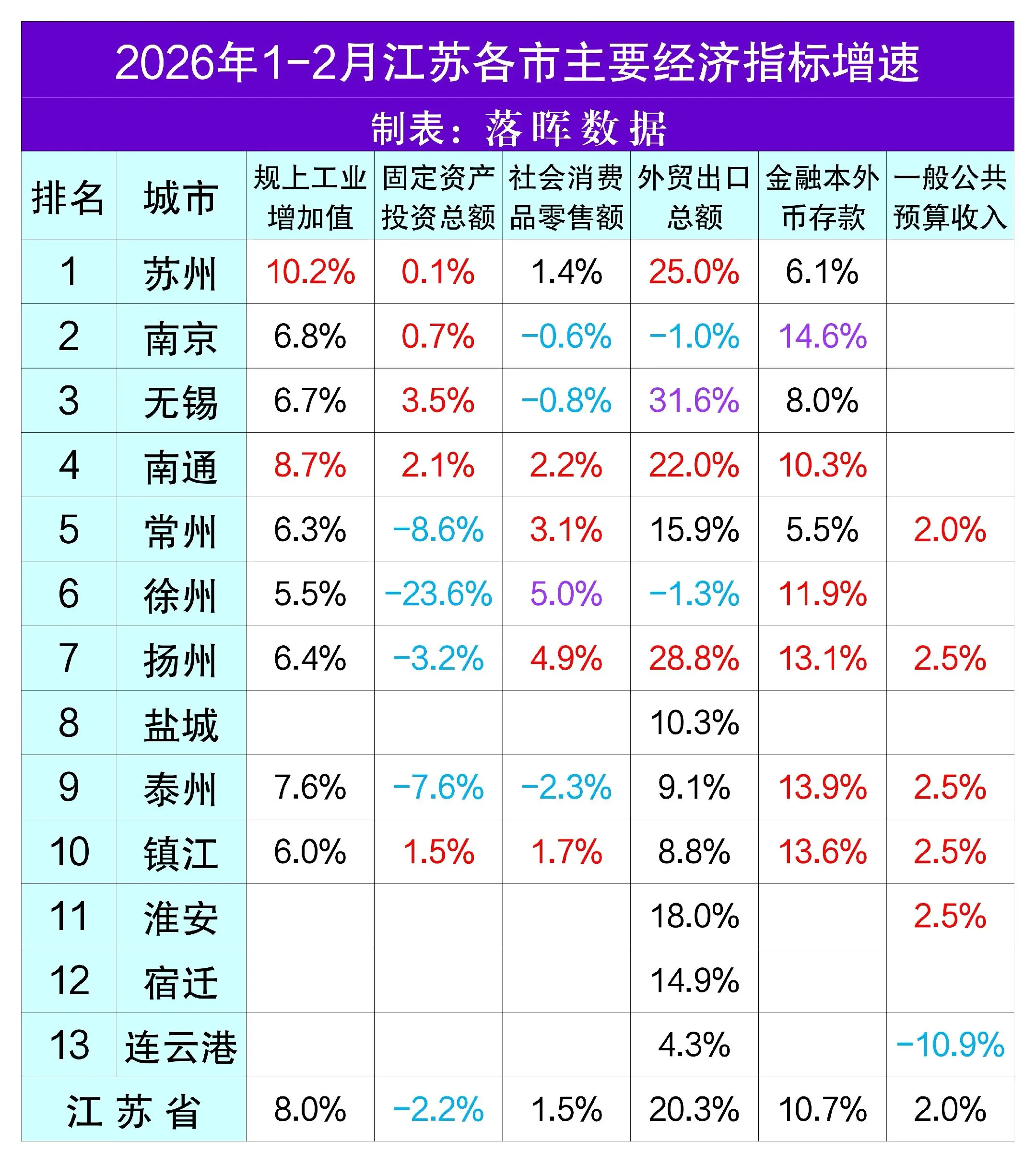 2026年1-2月江苏各市主要经济指标:工业生产保持高位运行,投资下行,消费低迷,金融活力较好,财政稳健增长