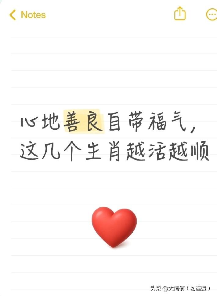 心地善良自带福气,这几个生肖越活越顺 这几个生肖天生心软厚道,有着菩萨心肠,一辈子贵人多、福气足。 属牛人 踏实肯干,懂得知恩图报,平时乐于助人,事业上机遇多,靠努力就能稳步向好,财运稳当。 属龙人 心胸敞亮,愿意分享帮扶他人,待人真诚,遇事总有人搭把手,生活顺心,财气也跟着来。 属马人心怀善意,热心公益,宁可自己吃亏也不愿委屈别人,一生平安喜乐,感情和睦少纷争。 属兔人温和稳重,心态积极不抱怨,处处为他人着想,人缘极佳,日子安稳舒心。 属猪人 温顺知足,做事踏实靠谱,亲和力强,易得贵人相助,事业生活都顺遂无忧。 心存善念,必有后福,愿大家平安喜乐,万事顺心,福运常伴左右。 愿你心宽福厚,事事顺遂,平安喜乐一辈子。