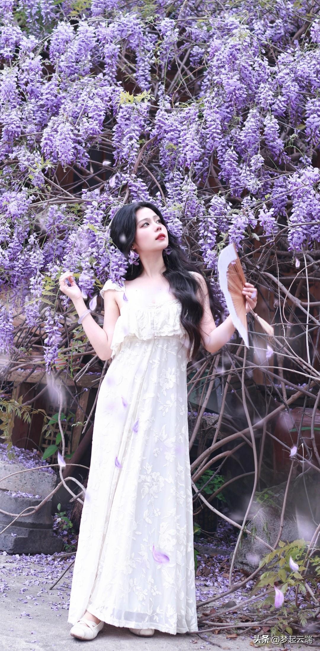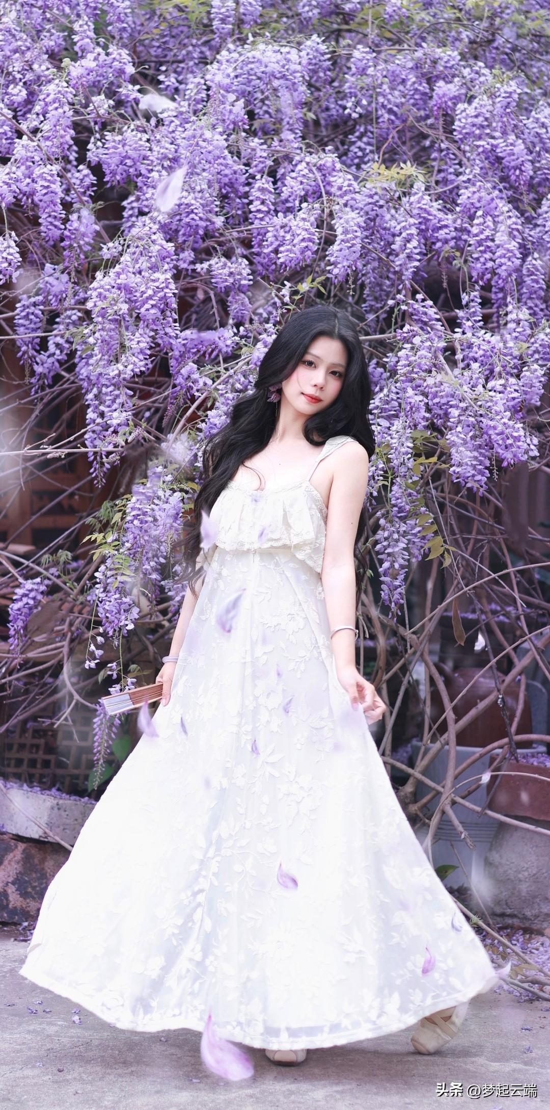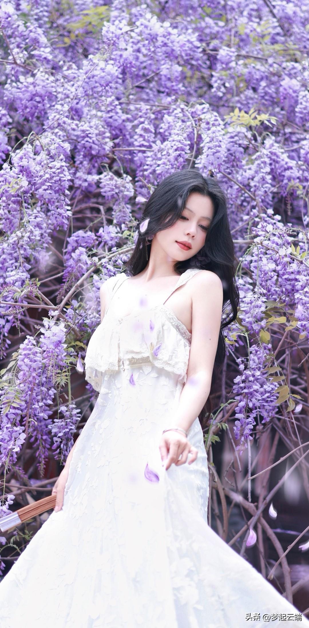 梦幻紫色花海中的优雅白裙女子。